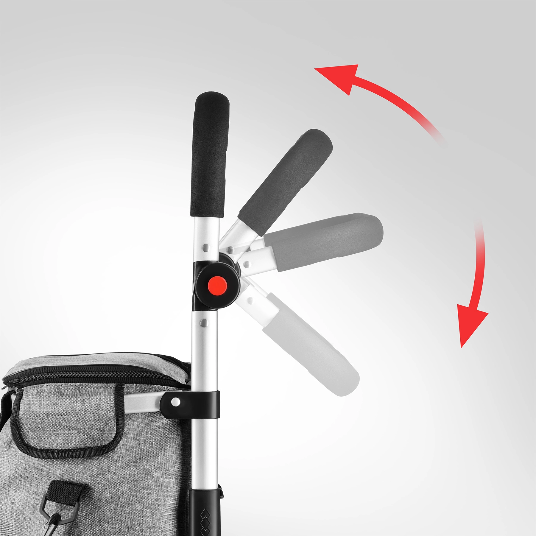 Pro každodenní jistotu nechybí reflexní prvky, které zvyšují viditelnost za šera. Velká kola 21 × 4,3 cm zvládnou dlažbu, obrubníky i nerovnosti, a nastavitelná rukojeť ve 3 polohách s pěnovým madlem zajistí pohodlné vedení. Tašku lze díky suchým zipům snadno odejmout a s ramenním popruhem nosit samostatně – ideální na pláž, piknik nebo víkend na chatě.