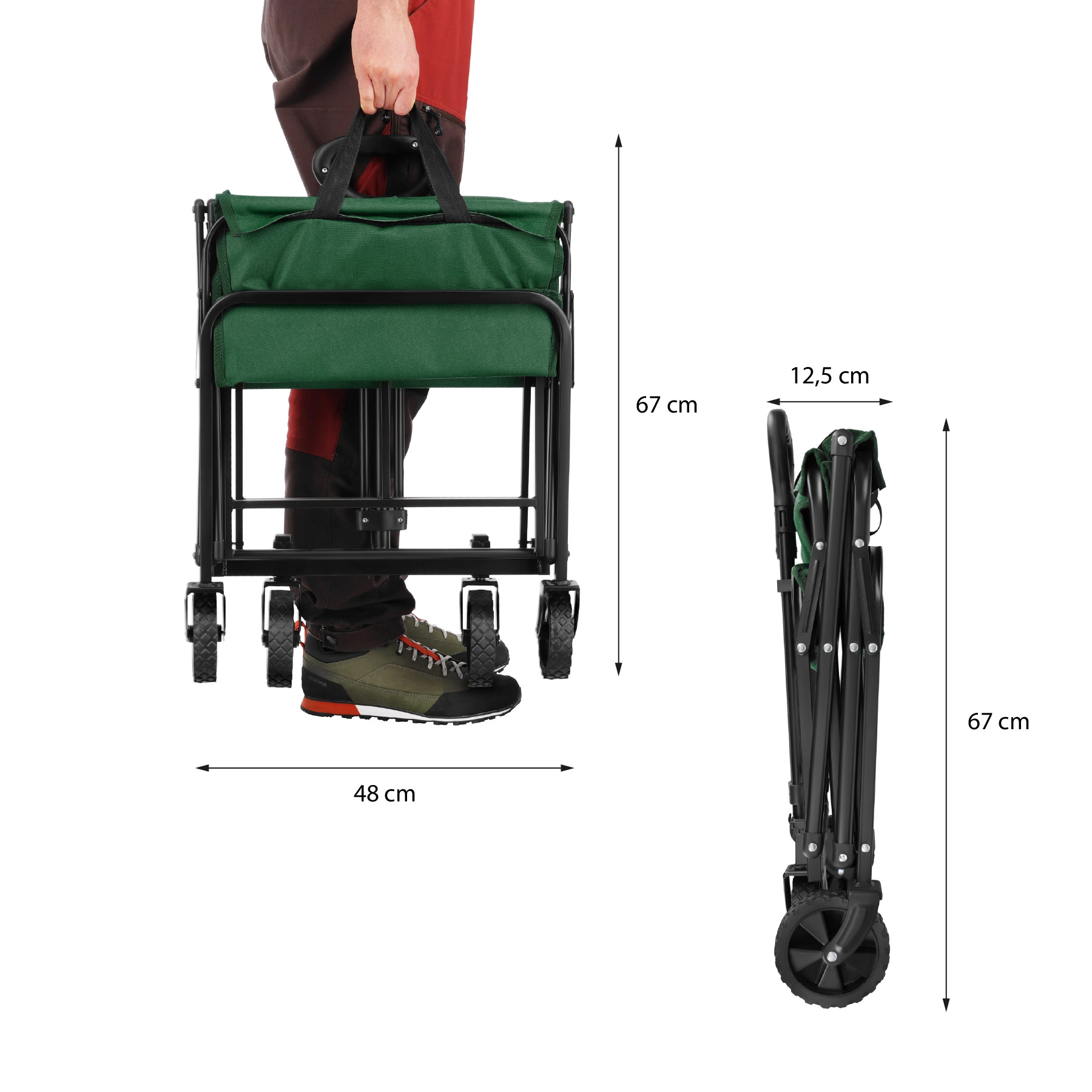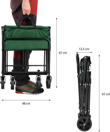 Materiál 600D Oxford s PVC je odolný proti oděru a znečištění, pomáhá chránit obsah před vlhkostí a je ideální na trávu, písek i do proměnlivého počasí. Po použití vozík během okamžiku složíte – kompaktní rozměry se snadno vejdou do kufru auta i do skříně.