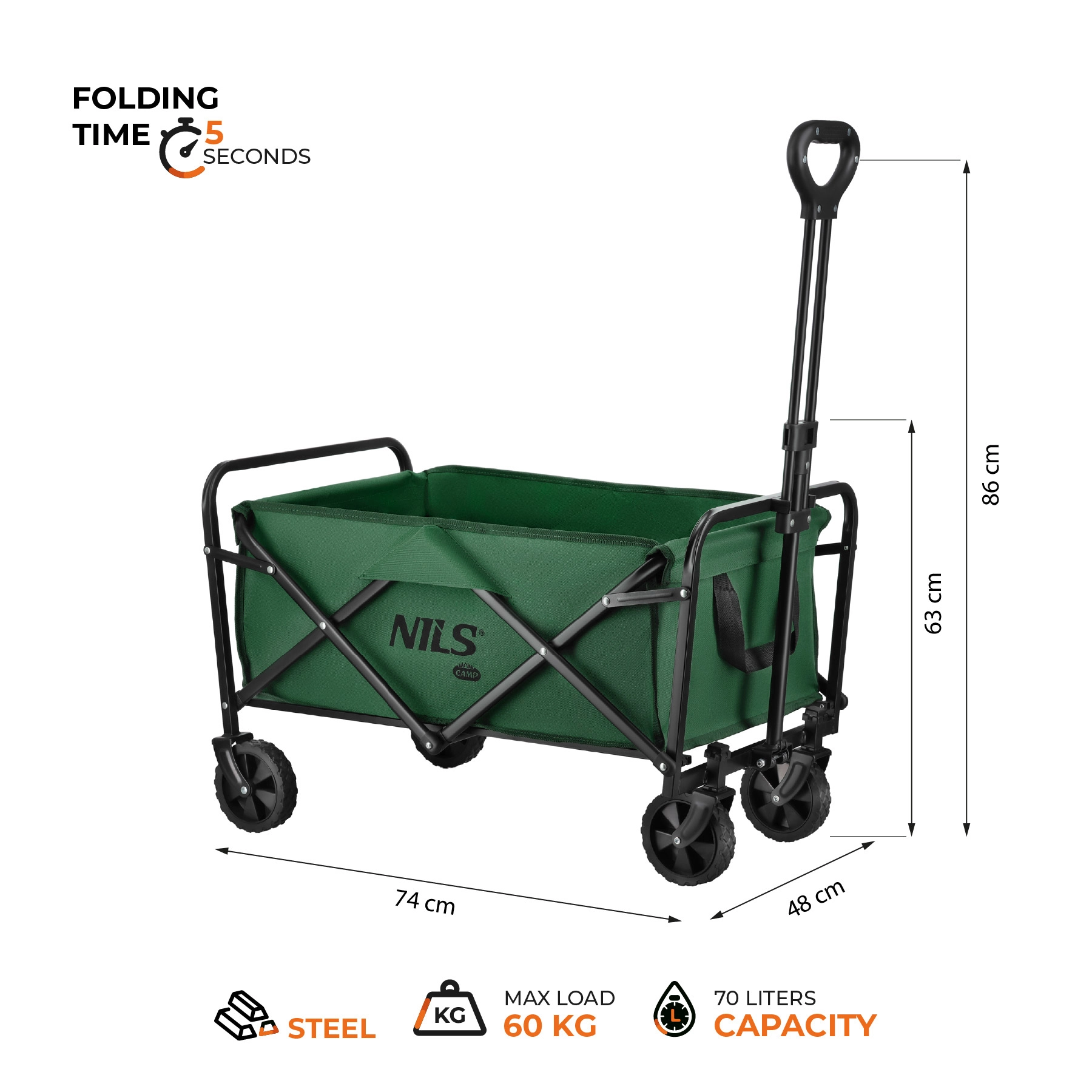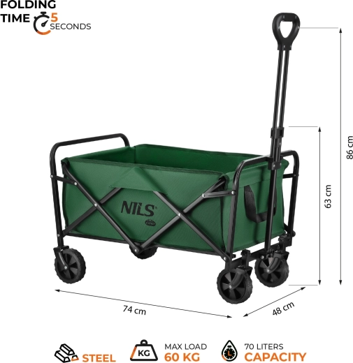 NILS Camp NC4306 je univerzální skládací vozík, který šetří čas i námahu. Díky kapacitě 70 litrů a stabilní konstrukci snadno odvezete deky, piknikové vybavení, sportovní potřeby i větší nákupy. Nastavitelná rukojeť umožňuje přirozený úchop pro různé výšky postavy.