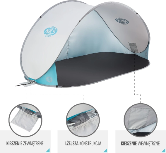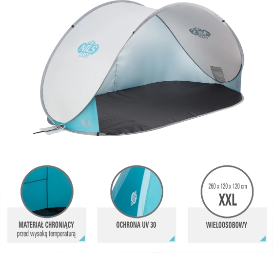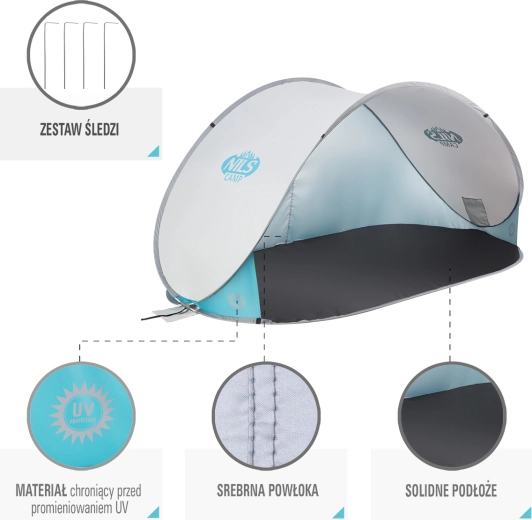 Samorozkládací plážový stan NILS Camp šedý je ideální volbou na pláž, koupaliště i k domácímu bazénu. Díky automatickému rozložení ho připravíte během vteřin, zatímco ochranná plachta z polyesteru s UV vrstvou odrazí až 96 % škodlivého UV záření. Praktická kruhová taška s uchem usnadní přenášení i skladování.