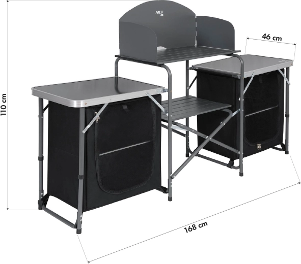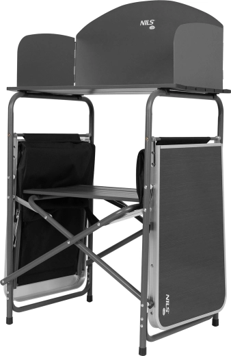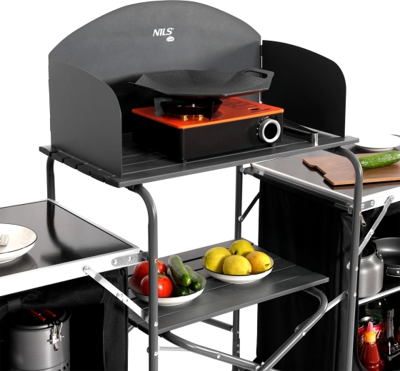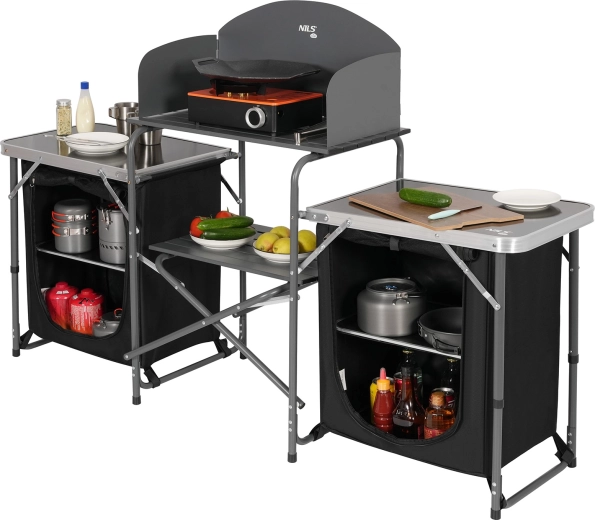 Hledáte promyšlené a odolné řešení pro venkovní vaření? Kempingová kuchyňská skříň NILS Camp kombinuje ergonomii, pořádek a komfort v kompaktním mobilním setu. Horní pracovní plocha z hliníkových lišt se závětřím je ideální pro kempingový vařič i přípravu surovin, zatímco dvě textilní skříňky s pevnými policemi z MDF udrží nádobí i potraviny přehledně po ruce.