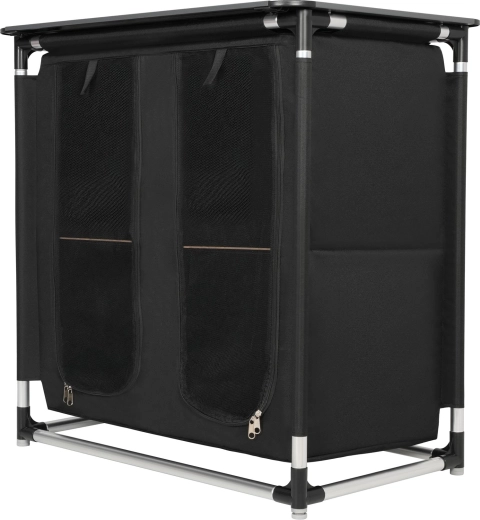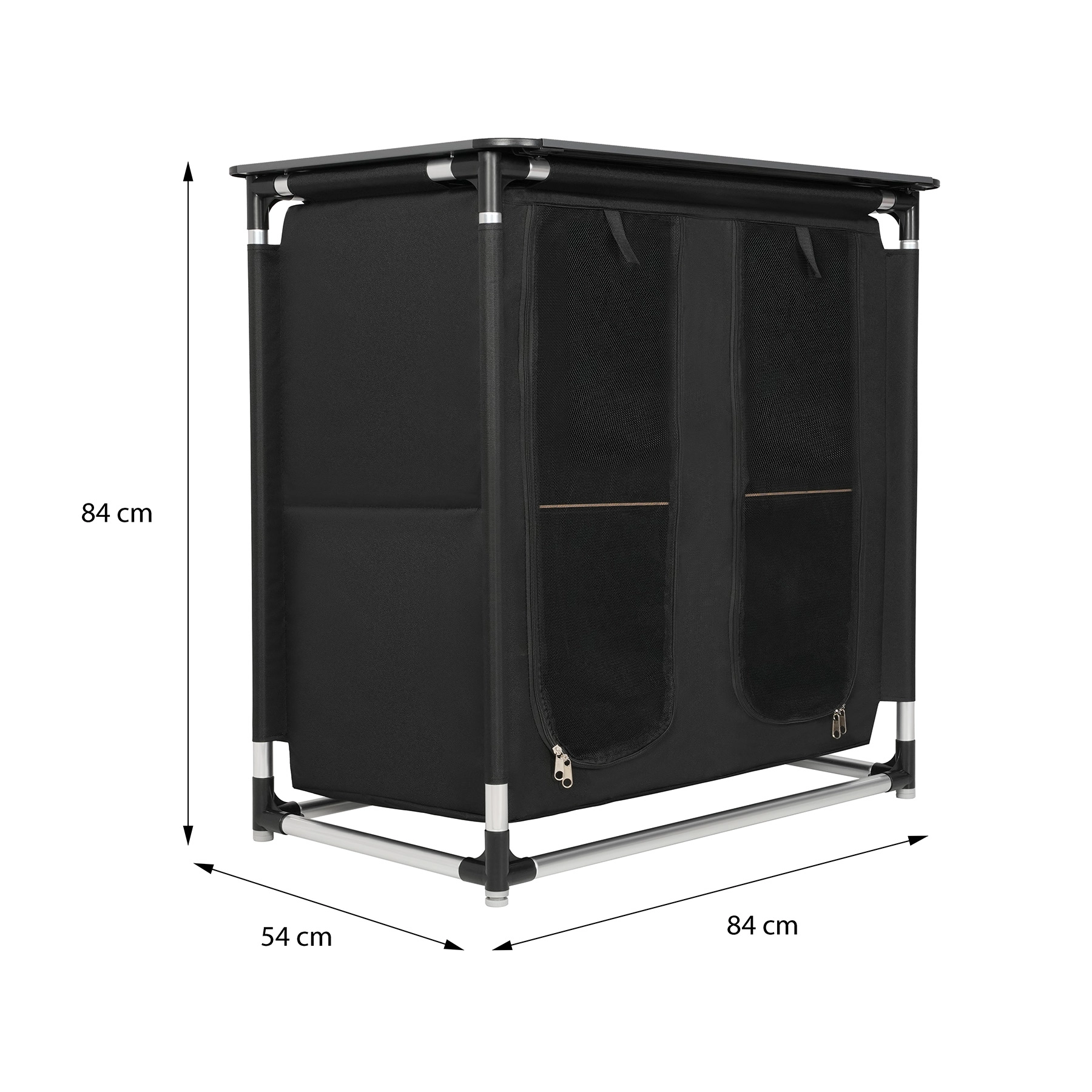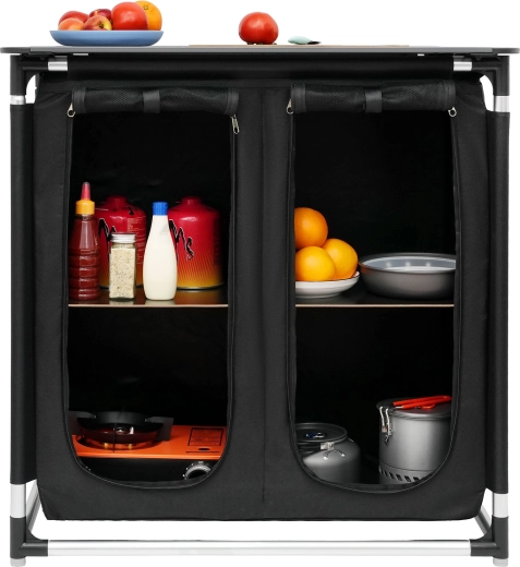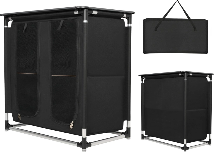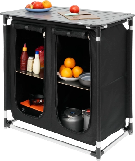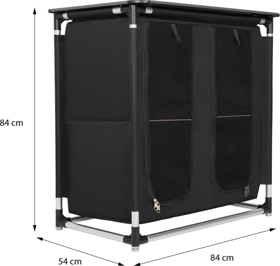 Vnitřní prostor tvoří 4 oddělené sekce s policemi z laminované překližky, ideální pro potraviny, nádobí, oblečení nebo turistické vybavení. Přední panely na zip chrání obsah před prachem, větrem a hmyzem. Horní deska z 9 hliníkových lamel o rozměru 83 × 52 cm slouží jako stabilní pracovní či odkládací plocha.