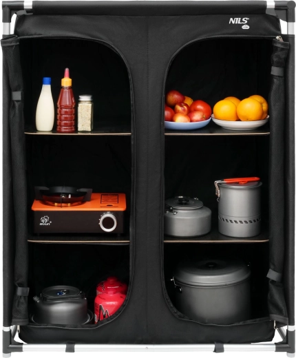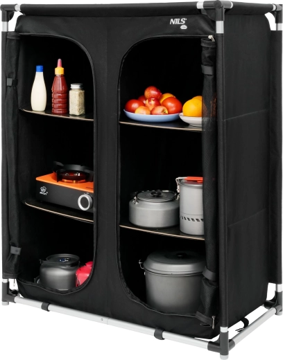 Skříň nabízí tři úrovně úložného prostoru s prostornými policemi a pevnými podložkami pro stabilitu i při větší zátěži. Přední panely z prodyšné síťoviny se zapínáním na zip chrání obsah před hmyzem a zároveň zajišťují optimální ventilaci, takže se vyhnete vlhkosti a nežádoucím pachům.