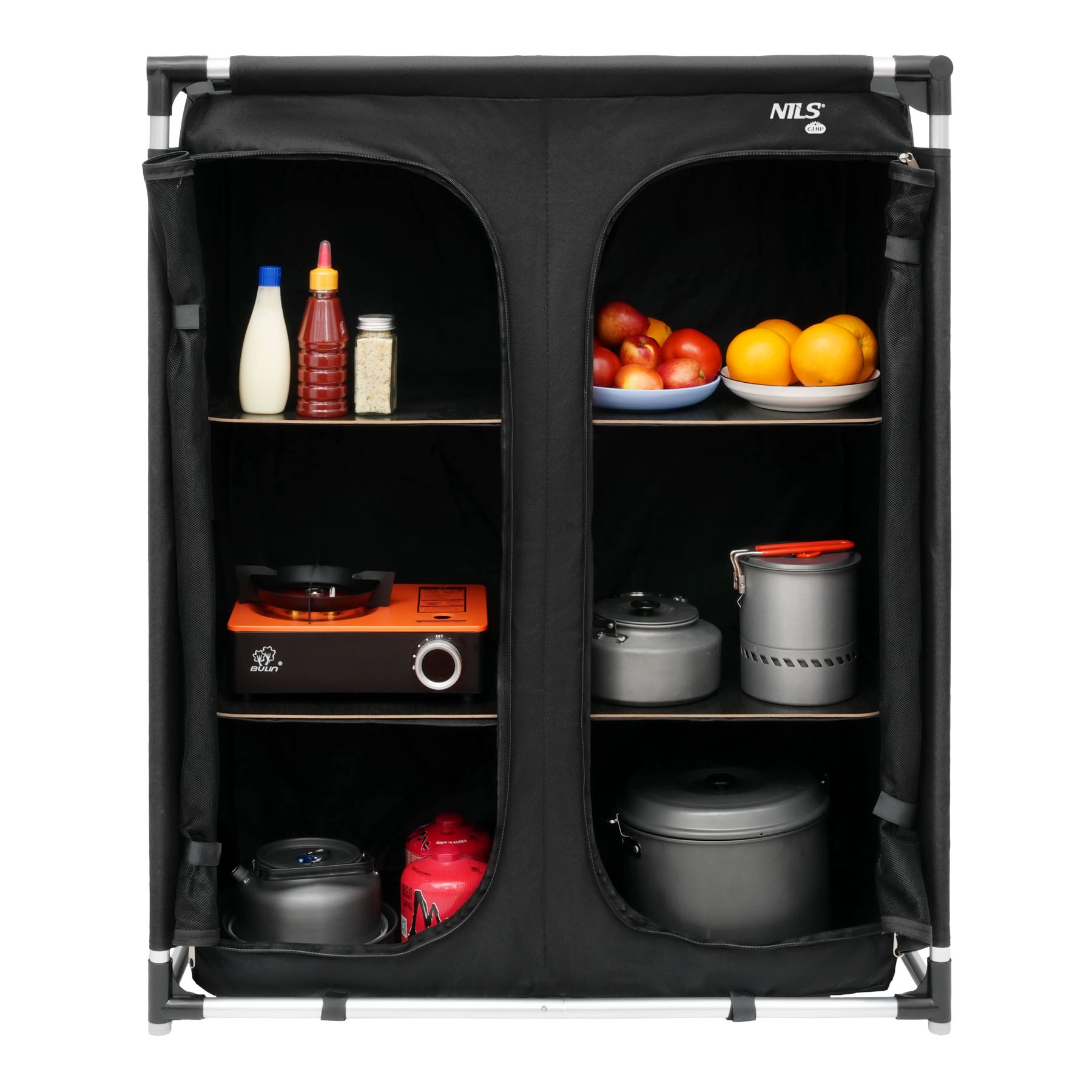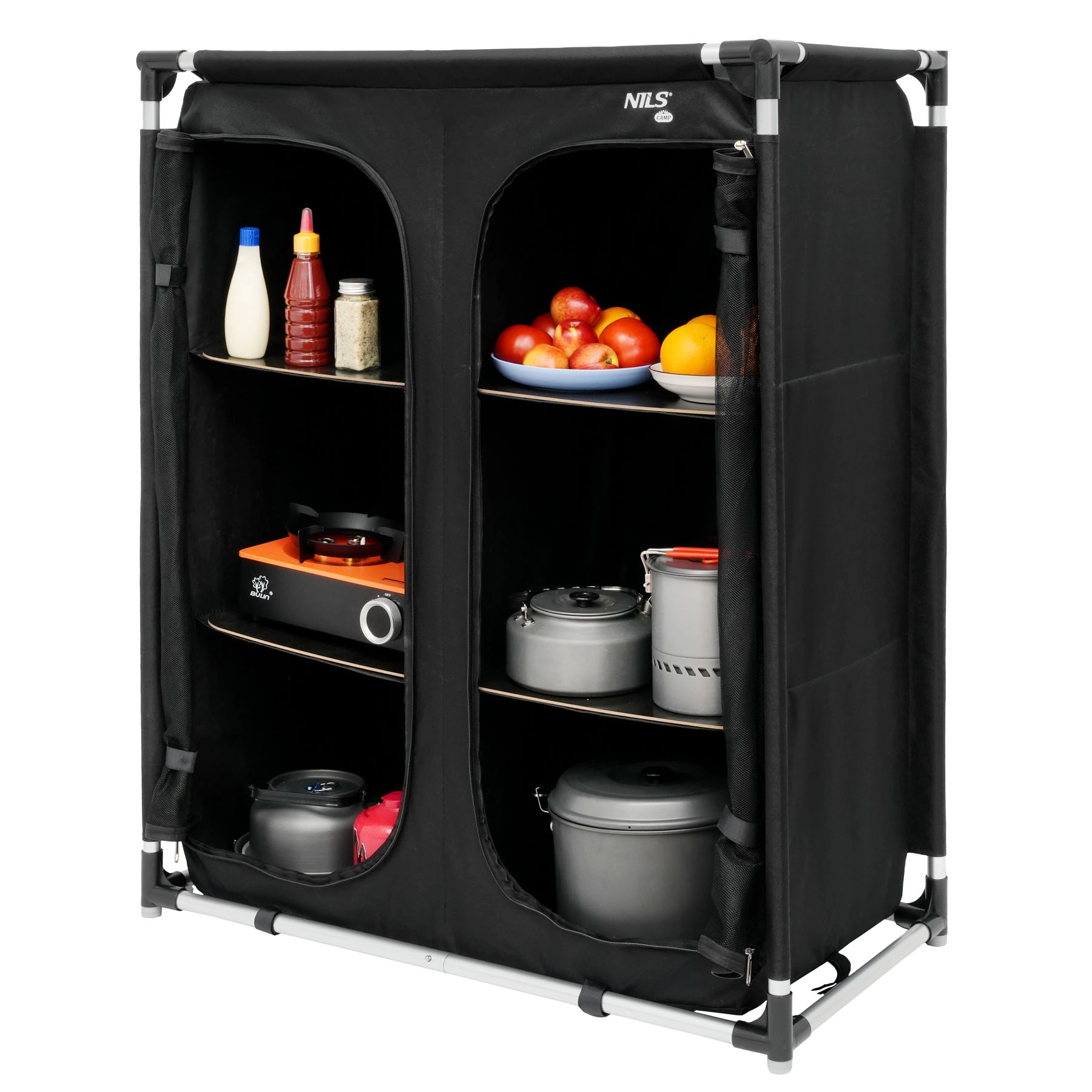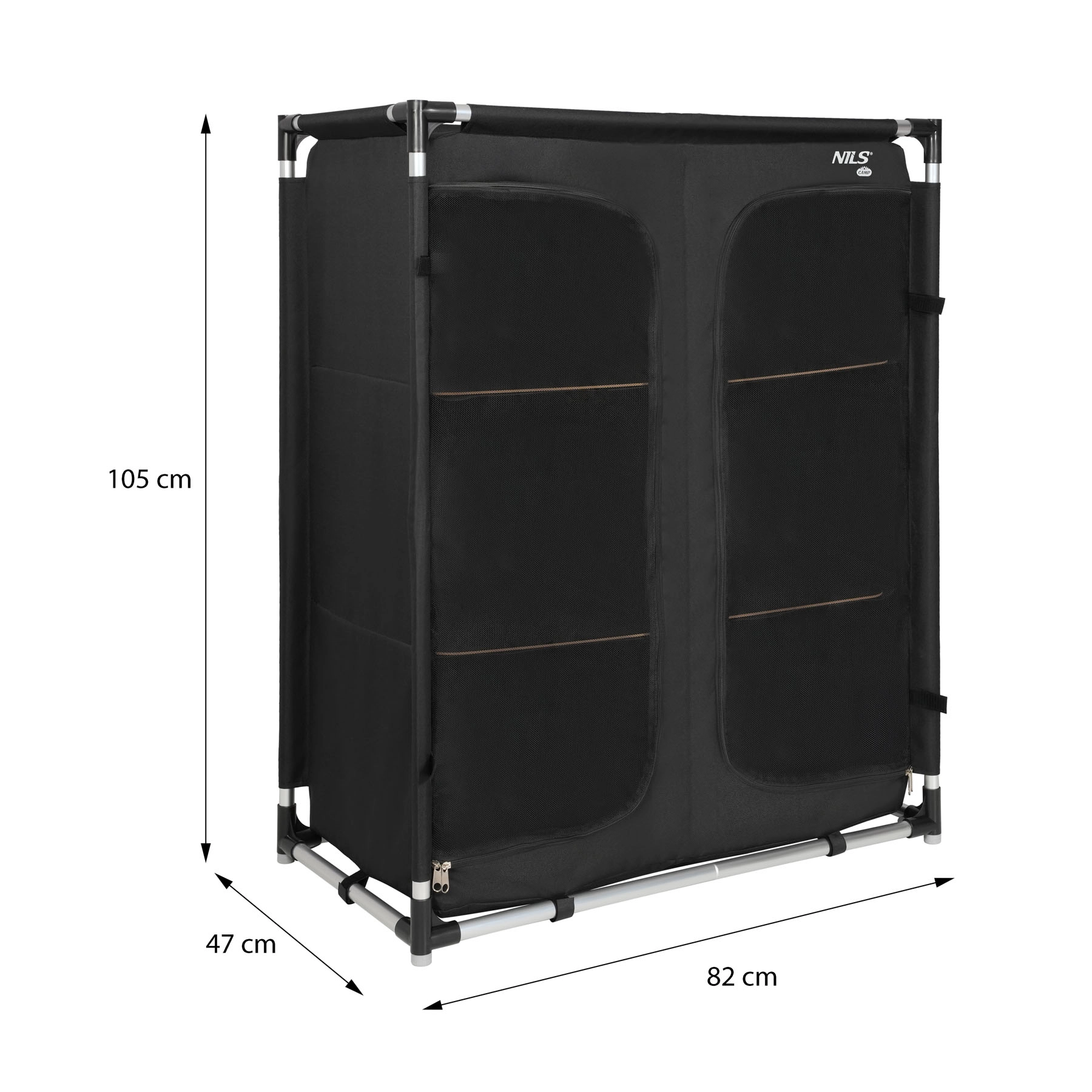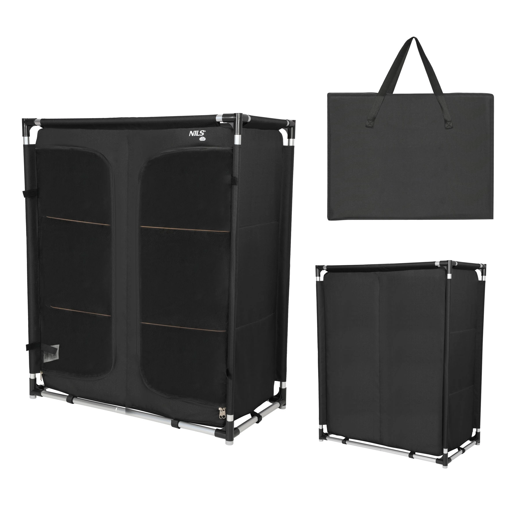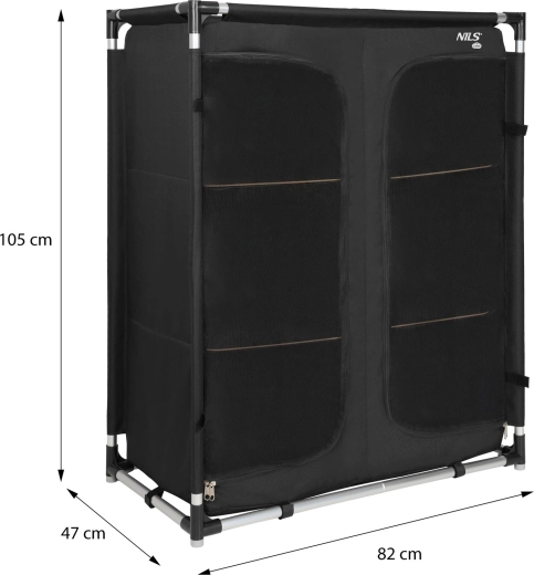 Hliníkový rám je lehký, ale odolný, takže skříň zůstává stabilní i na nerovném povrchu. Sestavení a složení zabere jen pár minut. Po složení ji uložíte do přiložené tašky – ideální řešení pro kempování, karavan, chatu nebo delší výlety s rodinou.