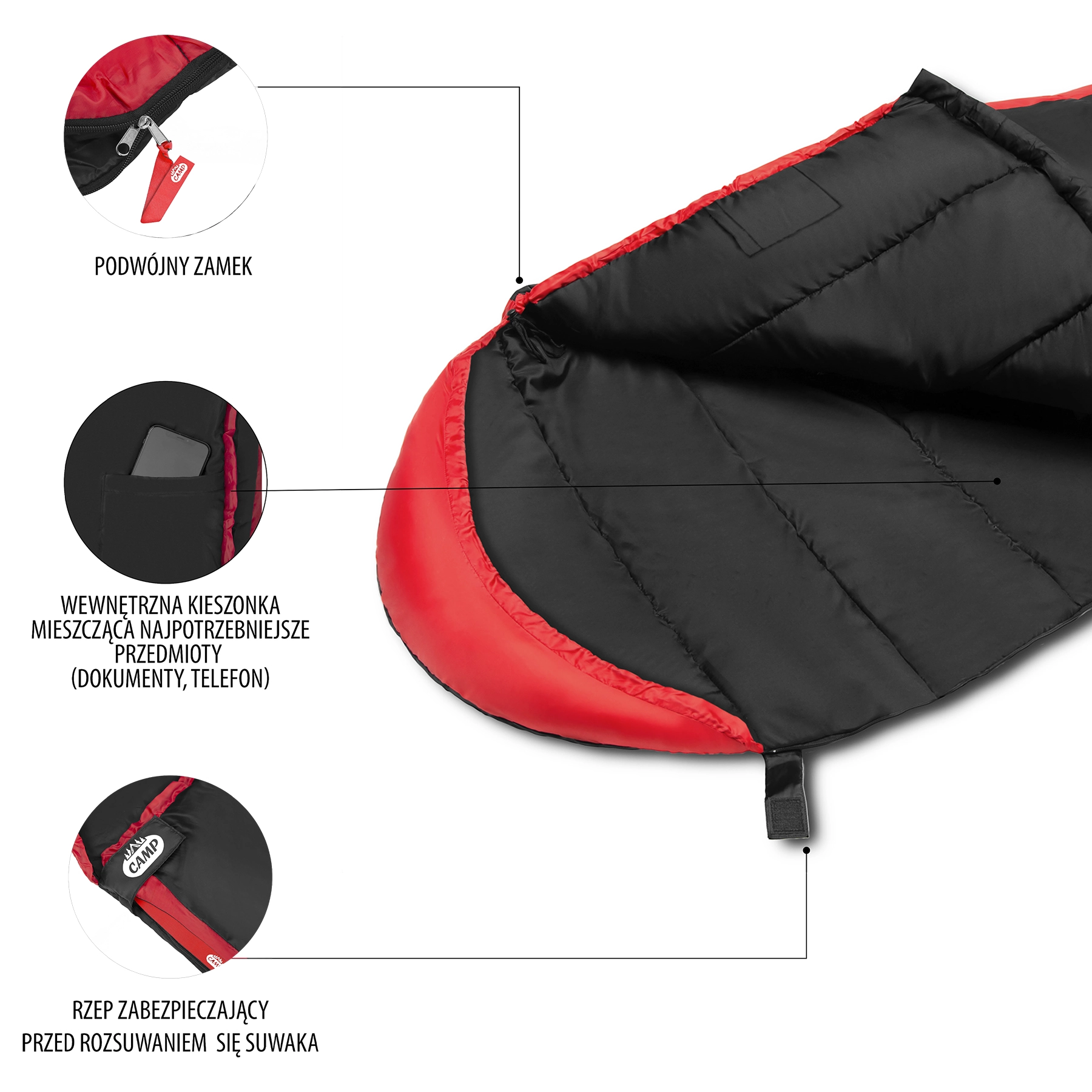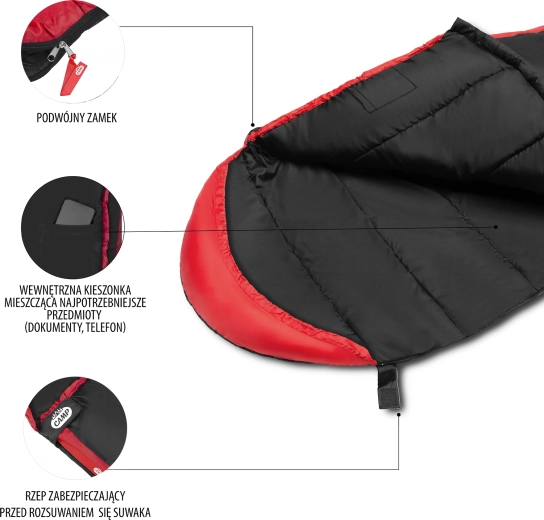 Oboustranný zip je kryt izolační légou a zajištěn širokou manžetou se suchým zipem, takže se během noci samovolně neotevře. Stahovací kapuce s brzdičkou dále omezuje únik tepla. Součástí je praktický kompresní obal, který po stažení zmenší objem přibližně o třetinu.