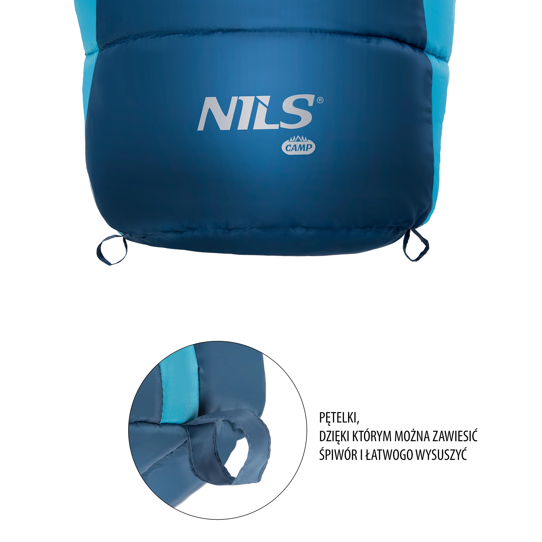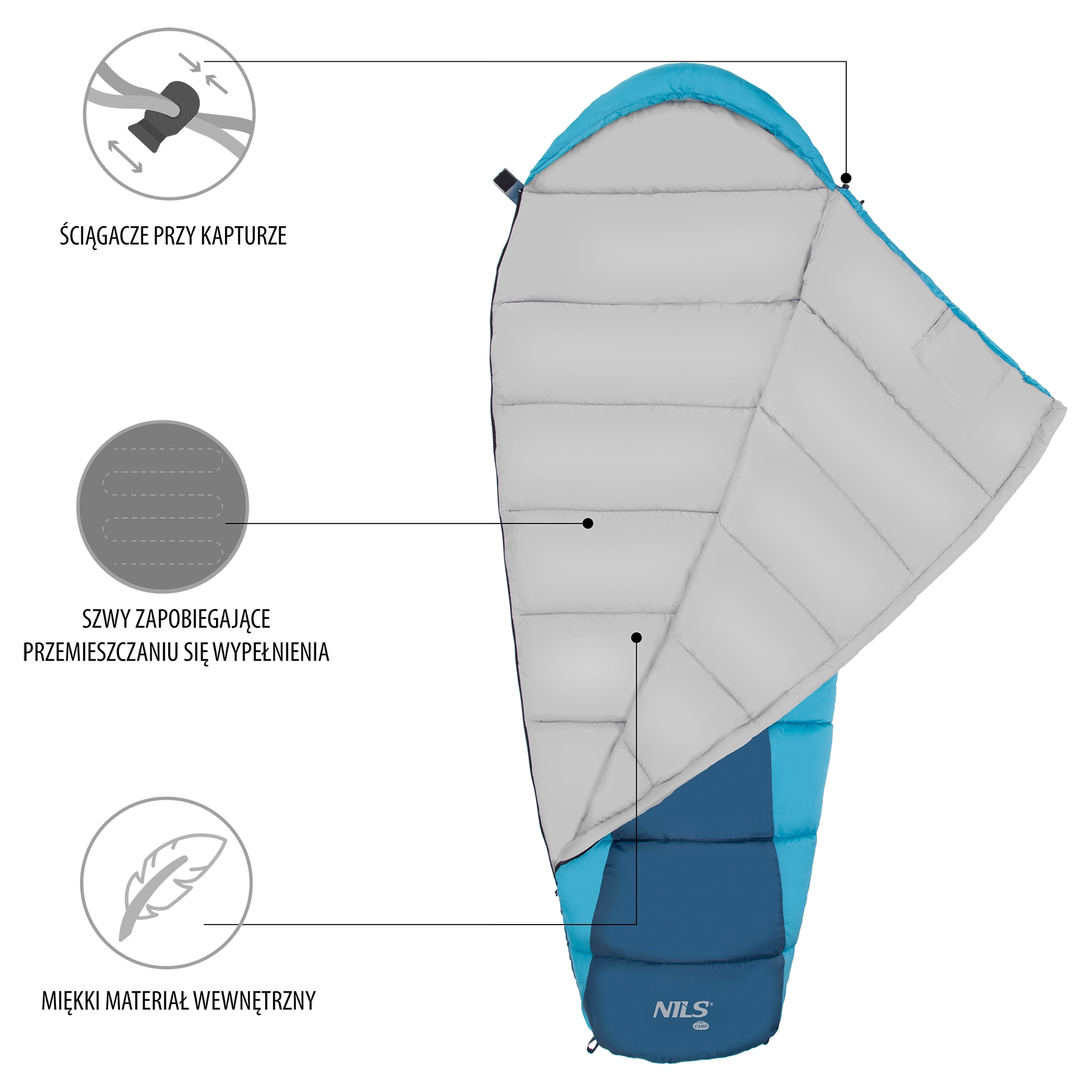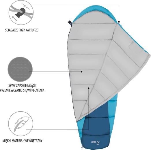 Spacák typu mumie NILS Camp je navržen pro pohodlný spánek v chladnějších podmínkách. Těsnější střih kopíruje tvar těla a spolu se stahovací kapucí udržuje teplo uvnitř. Vnitřní 190T Pongee je příjemný na dotek, zatímco vnější 190T polyester W/R Cire chrání před chladem a vlhkostí. Výplň z dutého vlákna 300 g/m² poskytuje rovnoměrnou a stabilní izolaci, kterou podporuje pečlivé prošití.