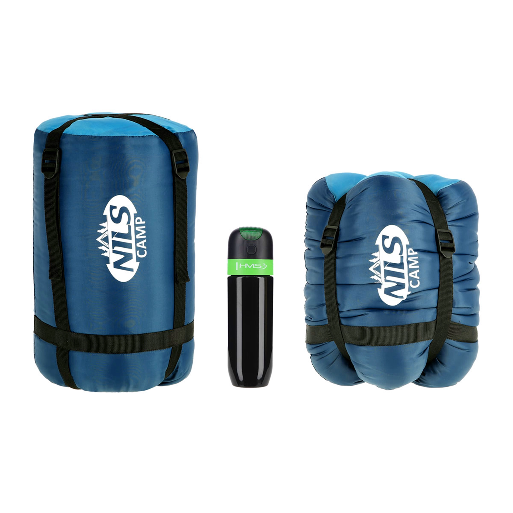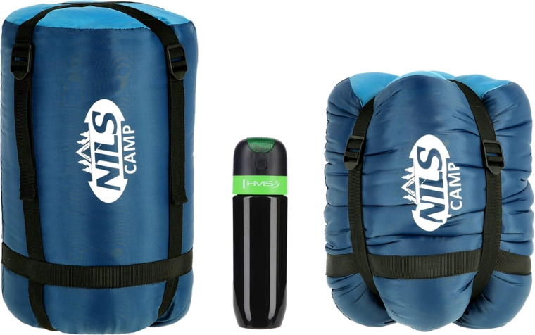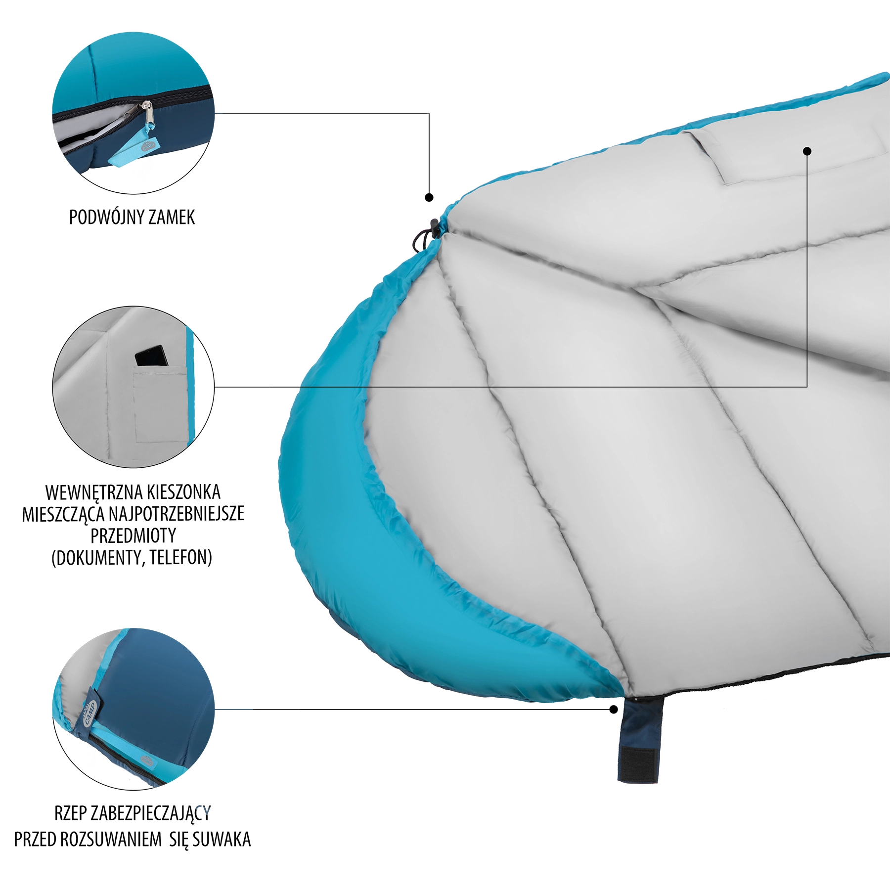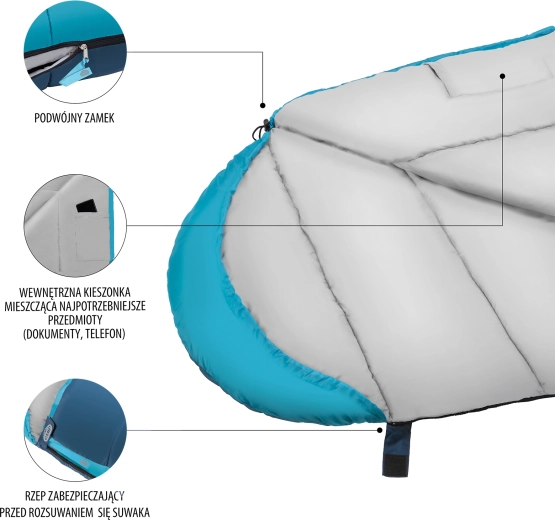 Praktické detaily zahrnují oboustranný zip jištěný širokou manžetou se suchým zipem, takže se samovolně nerozjíždí ani při otáčení. Zip je překryt izolační légou pro omezení tepelných ztrát. Součástí je kompresní obal s popruhy, který po stažení zmenší objem zhruba o třetinu – perfektní do batohu i do kufru.