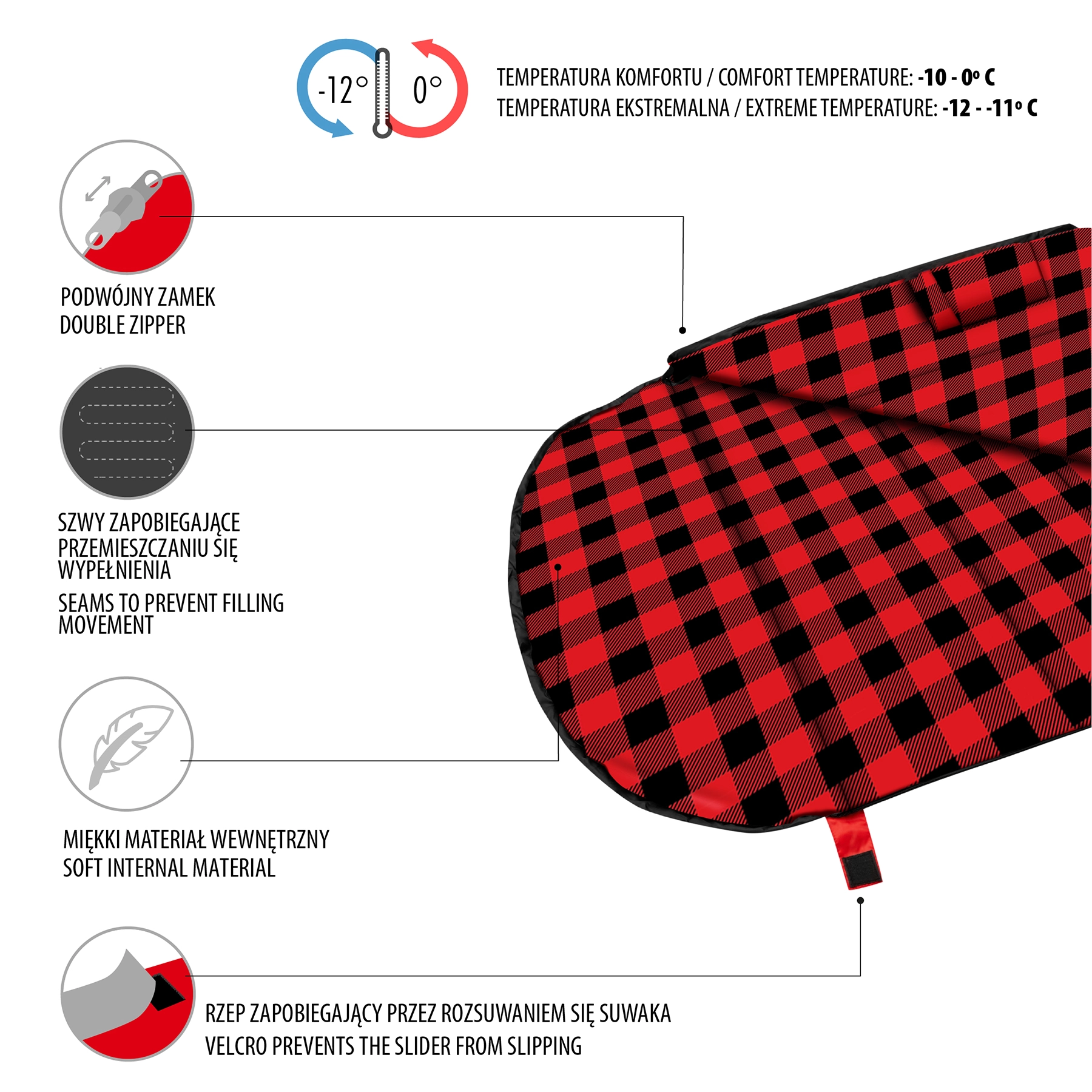 Praktický oboustranný zip je z vnitřní strany krytý izolační légou a zajištěný širokou manžetou se suchým zipem, aby se během spánku samovolně neotevíral. Dlouhý zip po boku i spodní straně umožňuje zcela rozevřít spacák na deku – skvělé řešení pro teplejší noci. Integrovaná kapuce se stahovací šňůrkou pomáhá udržet teplo u hlavy.