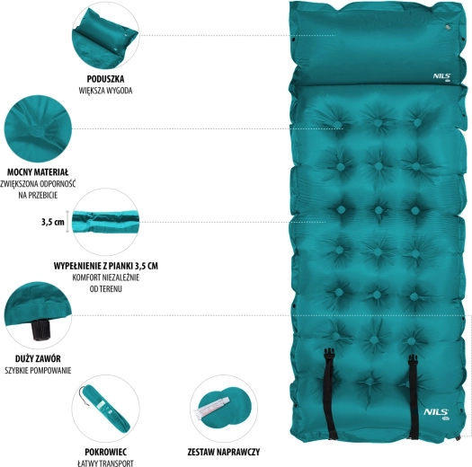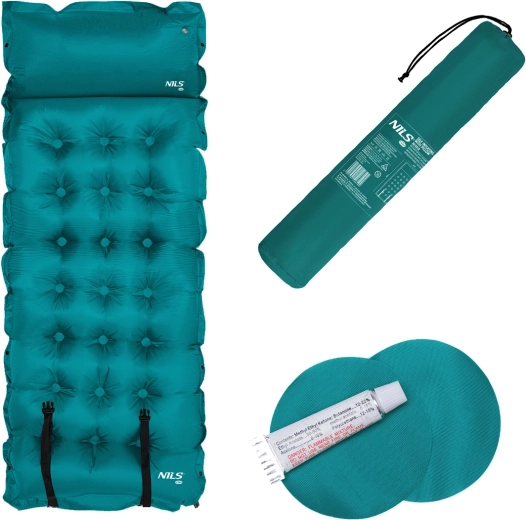 Samonafukovací karimatka NILS Camp modrá poskytuje jistotu pohodlí a izolace na výletech, festivalech i při kempování. Vnitřní pěna s otevřenými póry po otevření ventilu nasává vzduch a karimatka se sama rozvine do původního tvaru – stačí ji jen lehce dofouknout na ideální tvrdost. Odolná kombinace polyesteru 190T a PVC umožňuje použití i na nerovném povrchu.