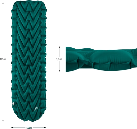 Velký ventil pro snadné nafouknutí i vyfouknutí a 5,5 cm vysoká izolace pro komfortní spánek na trávě, písku i jehličí.