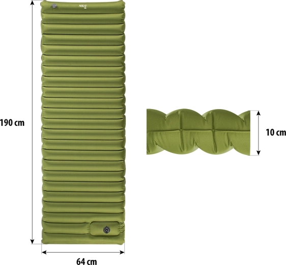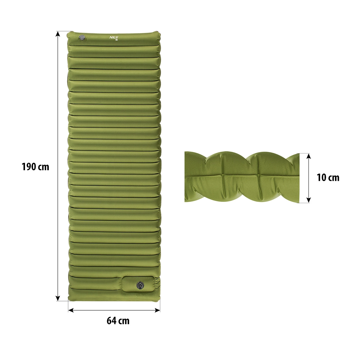 Užijte si klidný spánek mimo domov. Tato zelená karimatka NILS Camp se zabudovanou nožní pumpou se nafoukne během chvilky – stačí krátkými, svižnými pohyby došlapovat na pumpu a za minutu je hotovo. Při plném nafouknutí dosahuje komfortní výšky 10 cm, takže výborně izoluje od země a vyrovnává nerovnosti terénu.