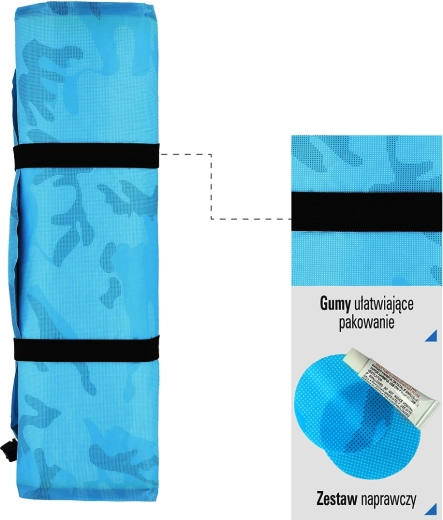 Horní materiál z polyesteru 190T s PVC povrchem zvyšuje odolnost proti oděru a vlhkosti, takže se karimatka hodí i na nerovný povrch. Po použití ventil otevřete, karimatku srolujte od protilehlé strany, zajistěte řemínky a uložte do přepravního vaku – snadné balení i přenášení.