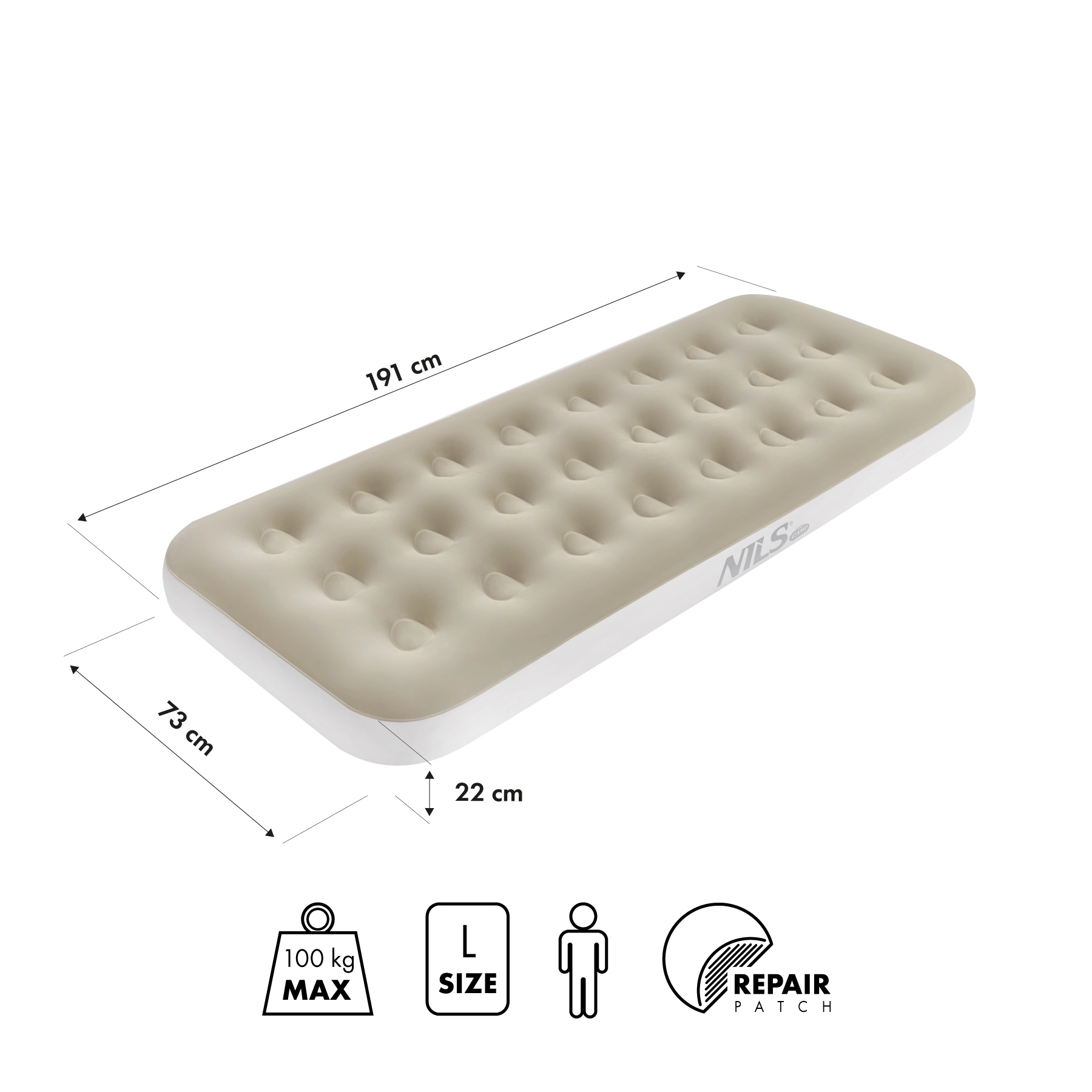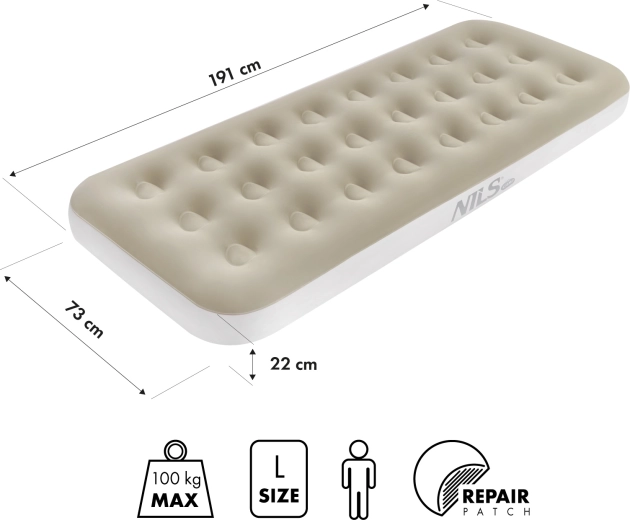 Praktická nafukovací matrace NILS Camp v béžové barvě je ideální pro domov i kempování. Nabízí pohodlný spánek, odolné PVC, protiskluzový povrch a dvojitý ventil pro rychlé nafouknutí. Díky rozměrům 191 × 73 × 22 cm a nosnosti 120 kg poskytuje stabilní oporu a výbornou izolaci od země.