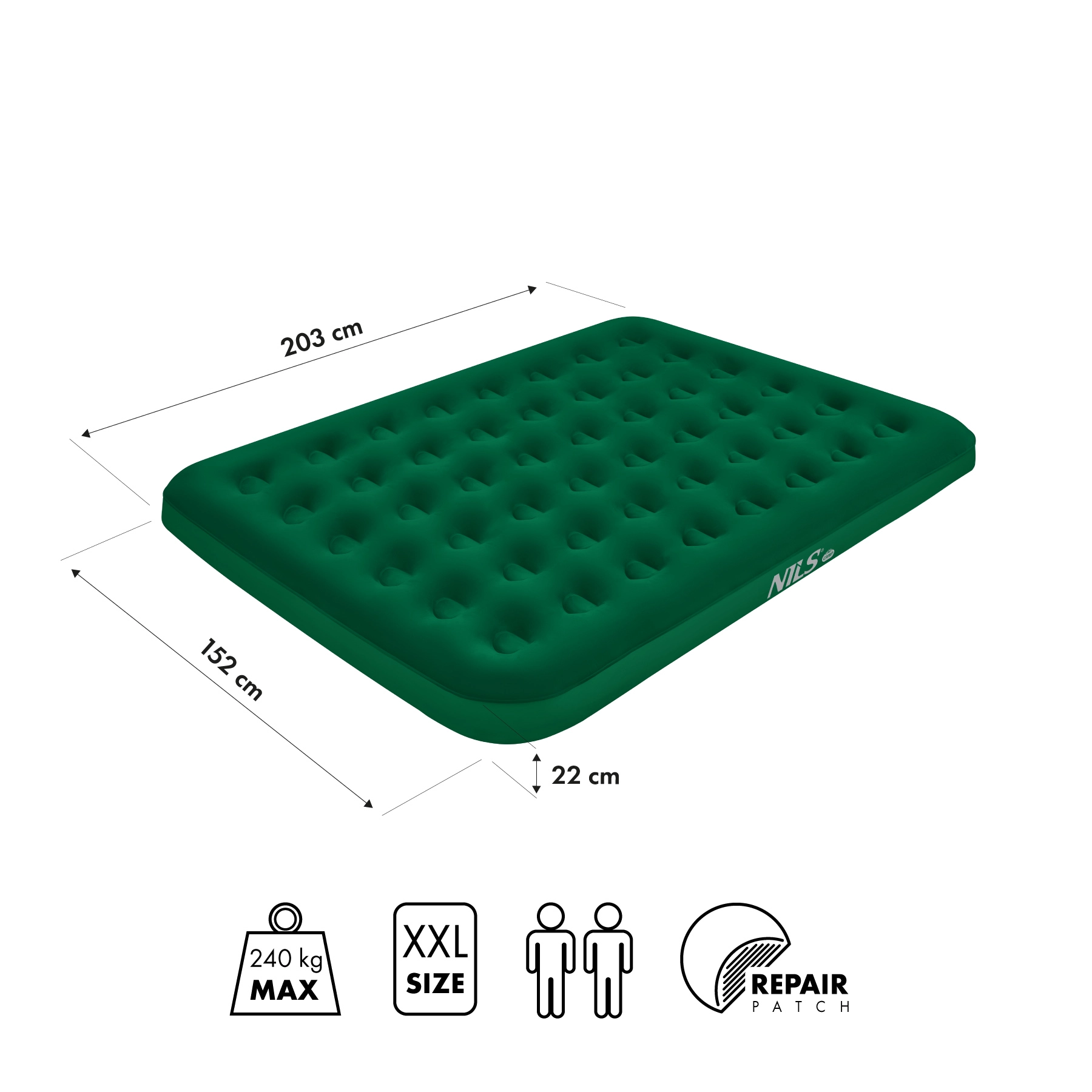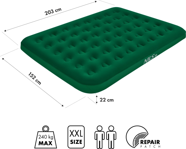 Nafukovací matrace NILS Camp je ideální volbou jako přistýlka do domácnosti i spolehlivý parťák na kempování, festivaly či víkendové výlety. Velkorysá plocha poskytuje více místa než běžné dvoulůžko a výška 22 cm účinně izoluje od chladné či nerovné země.