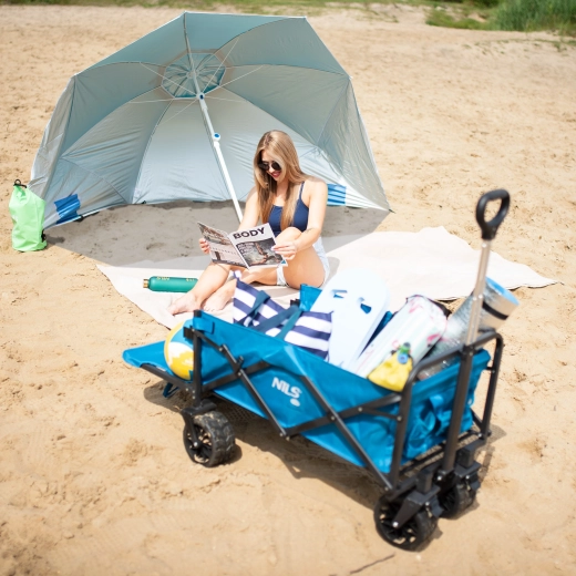 Díky dvěma bočnicím o šířce 75 cm lze slunečník během chvilky položit a proměnit v plážovou zástěnu se šířkou 320 cm a výškou 155 cm. Bočnice můžete při používání jako klasického slunečníku připnout k vrchlíku pomocí plastových karabinek, aby nepřekážely. Součástí balení je přepravní vak s popruhem přes rameno a 4 kolíky pro ukotvení zástěny.
