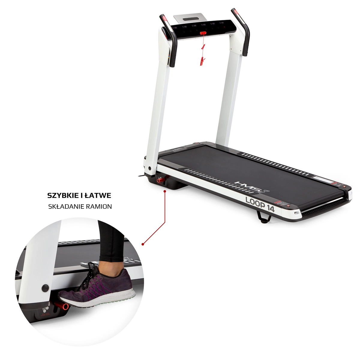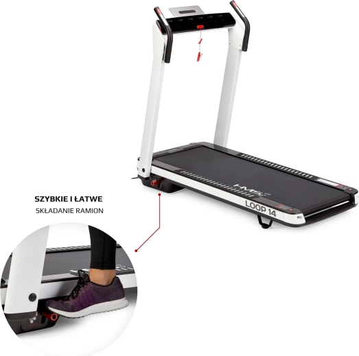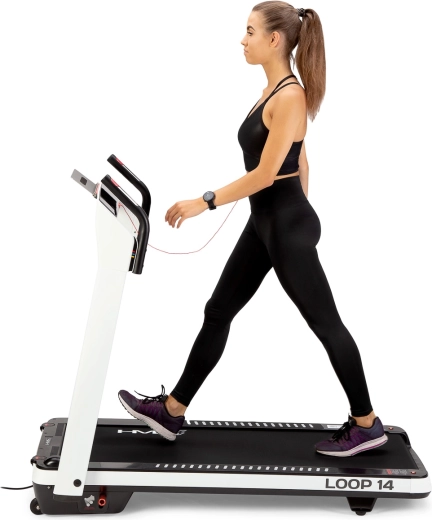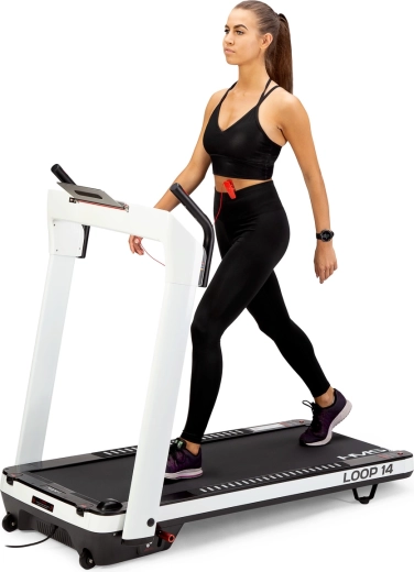 HMS Loop 14 je moderní domácí běžecký pás, který kombinuje výkonný a tichý motor (špičkově 2,5 HP) s rychlostí až 14 km/h a automatickým nastavením sklonu v rozsahu 0–12°. Běžecká plocha 130 × 48 cm je na šesti místech odpružena silikon-gelovými silentbloky pro nižší zátěž kloubů a pohodlnější běh i chůzi.