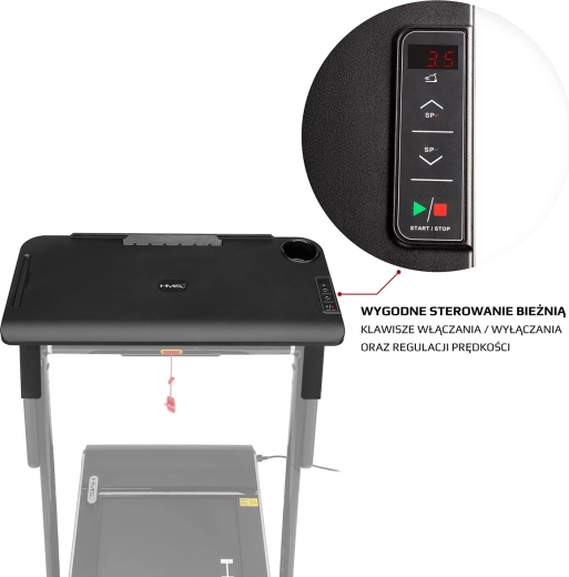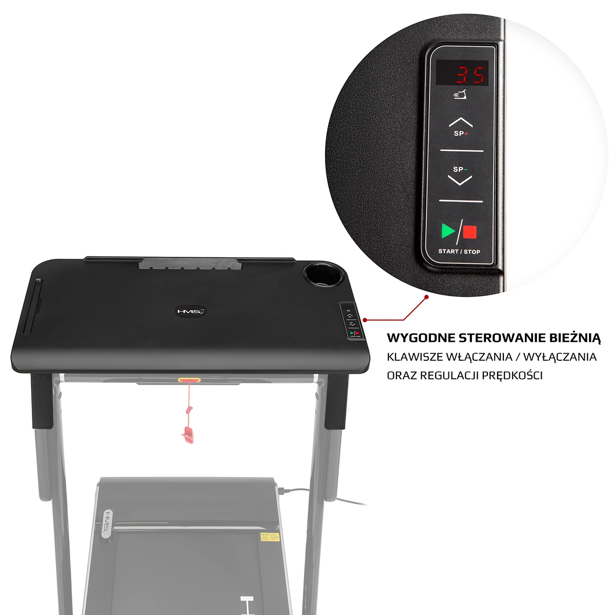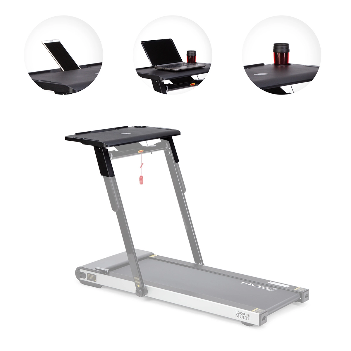 Pracovní stůl HMS STB12 promění váš běžecký pás HMS LOOP12 v chytré pracoviště pro chůzi a práci současně. Nabízí stabilní odkládací plochu pro notebook, držák na nápoj i slot na tablet. Díky integrovanému ovládání lze pás zpomalit nebo zastavit, přičemž je rychlost z bezpečnostních důvodů omezena na 6 km/h pro pohodlné psaní a práci.