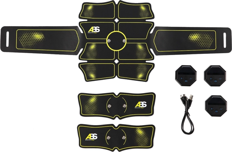 1× velká břišní elektroda, 2× malá elektroda (paže/nohy), 3× řídicí jednotka, 1× nabíjecí kabel 3v1 (microUSB)