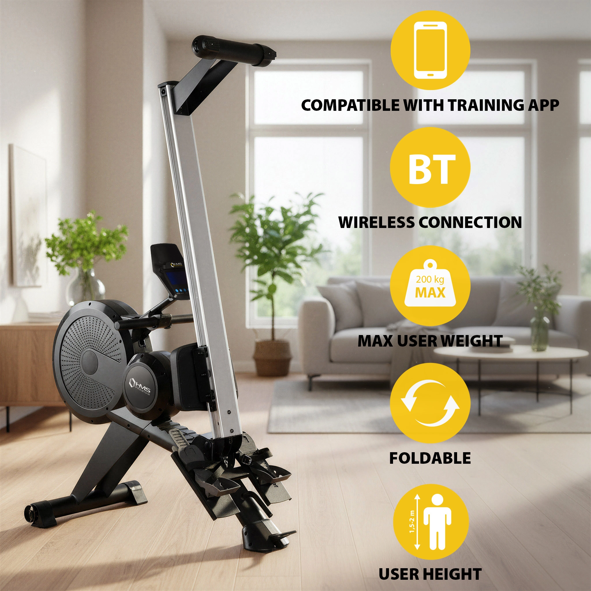 HMS Premium ZM1856 je profesionální magnetický veslařský trenažér navržený pro intenzivní celotělový trénink. Setrvačník 4 kg a přesná elektronická regulace odporu zajišťují plynulý, realistický záběr a rovnoměrné zatížení svalů. Díky posuvu sedadla 100 cm a vysokému uložení sedla je vhodný i pro vyšší sportovce a dlouhé tréninkové jednotky.