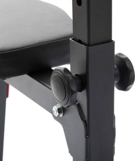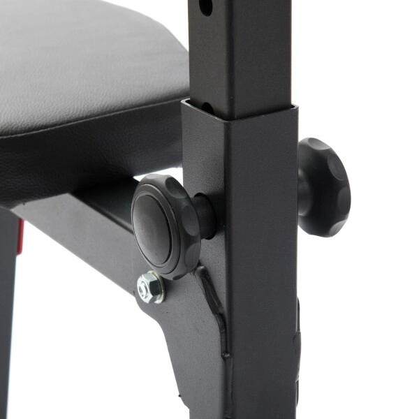 Ergonomicky tvarované polstrování z kvalitní syntetické kůže s dvojitým prošitím poskytuje pohodlí i při náročném tréninku. Odkládací háky s hrubou ochrannou gumou minimalizují hluk a zabraňují poškrábání osy i konstrukce. Práškově lakovaný povrch chrání rám před oděrem a korozi a gumové nožky udržují lavici pevně na místě bez poškození podlahy.