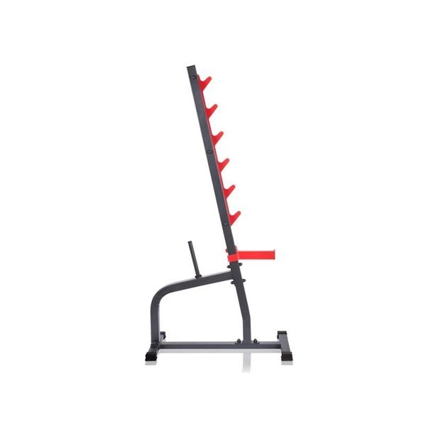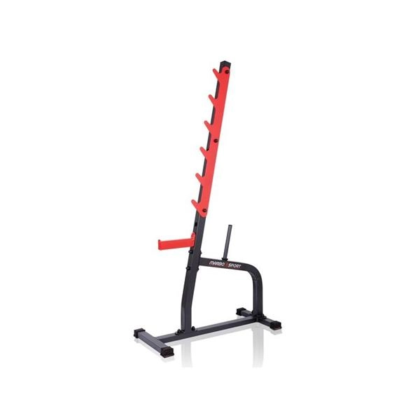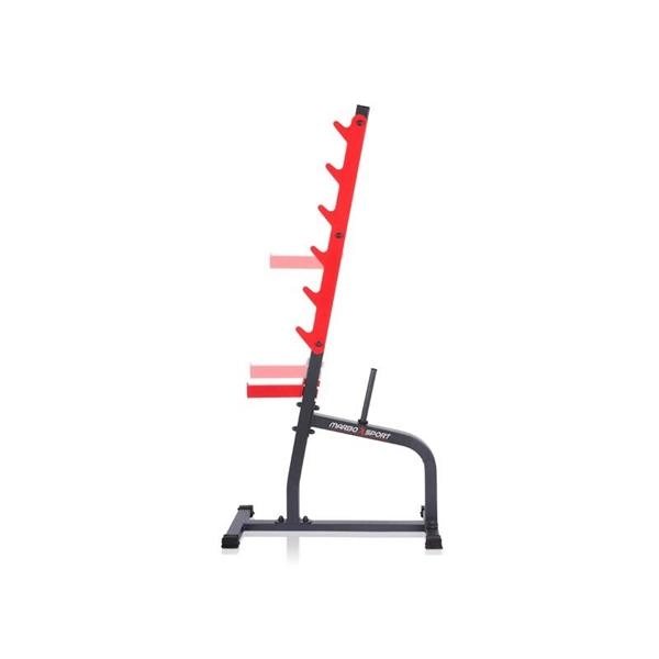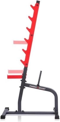 Robustní ocelová konstrukce s práškovým lakem zajišťuje dlouhou životnost a vysokou stabilitu i při těžkých trénincích. Stojany lze používat samostatně pro dřepy a tlaky, nebo je kombinovat s posilovací lavicí. Integrované trny na kotouče (Ø 25 mm, délka 22 cm) umožní mít závaží vždy po ruce a udržet tréninkové místo přehledné.