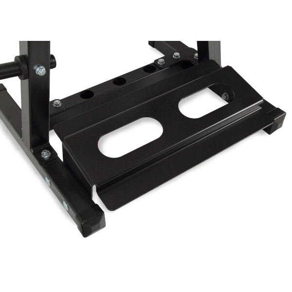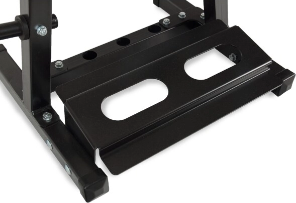Díky chytrému rozvržení odkládacích bodů uložíte na jednom místě kotouče s vrtáním 25 mm, osy 30 mm i jednoruční činky. Šetříte prostor, zkracujete čas mezi sériemi a minimalizujete riziko poškození vybavení.