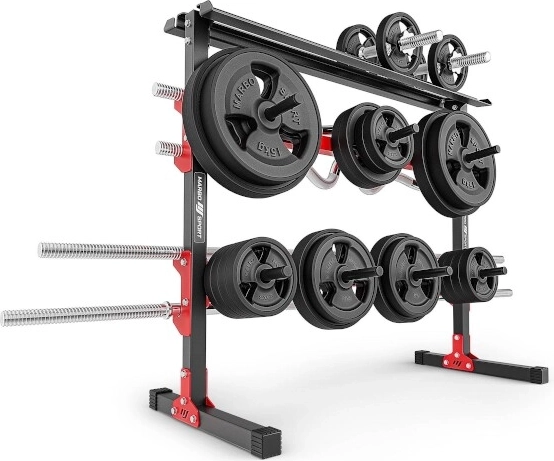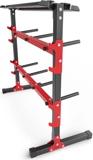 Univerzální stojan na činky, kotouče a osy MARBO SPORT nabízí nosnost až 300 kg, 7 trnů na kotouče, polici na jednoručky a háky pro 4 vzpěračské osy. Stabilní ocelová konstrukce s práškovým lakem a gumovými podložkami chrání vybavení i podlahu.