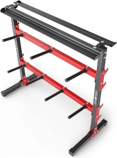 Odkládací trny s průměrem 25 mm a délkou 19 cm jsou kompatibilní s běžnými litinovými i olympijskými kotouči. Každý trn je opatřen gumovou podložkou pro ochranu disků. Robustní ocelová konstrukce s práškovým lakem zajišťuje dlouhou životnost a vysokou stabilitu i při zatížení do 300 kg.