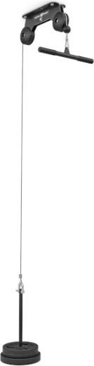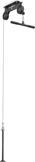 Součástí balení je tricepsový adaptér, který rozšíří možnosti tréninku o stahování kladky na triceps, přítahy či bicepsové tahy. Gumový doraz na konci lanka chrání konstrukci při náhlém puštění. Montáž do stropu šetří místo a umožňuje plynulé provádění cviků, jako jsou lat pulldown, tricepsové stahování či přítahy v sedě s vlastním úchopem.