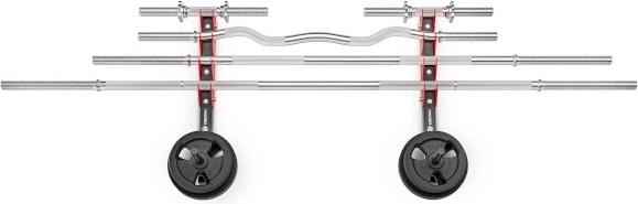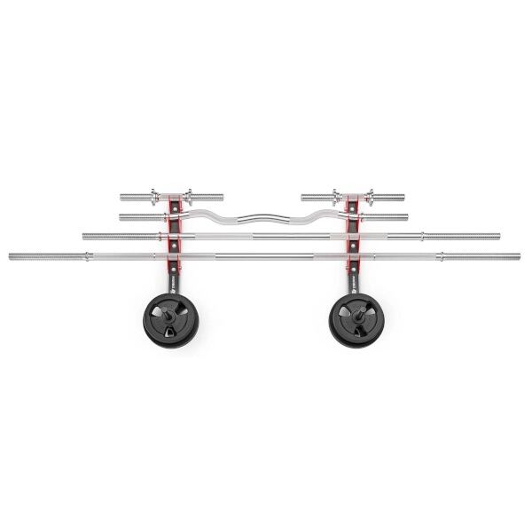 Každý ze dvou profilů se montuje do zdi pomocí čtyř kotev (kotvící materiál není součástí balení – zvolte typ dle materiálu zdi). Po instalaci získáte 4 páry držáků pro osy (až 4 obouruční osy nebo až 8 jednoručních hřídelí) a 2 trny pro kotouče o délce 21 cm a průměru 2,5 cm. Ideální řešení pro domácí posilovny, kde je prioritou pořádek, bezpečnost a úspora místa.