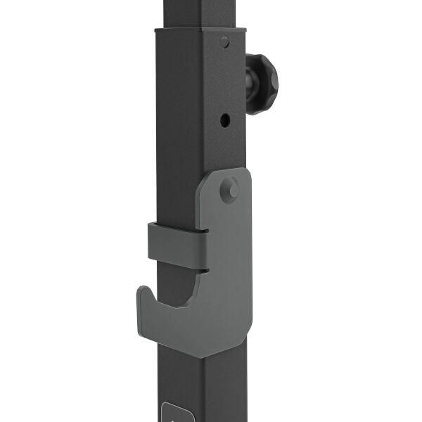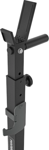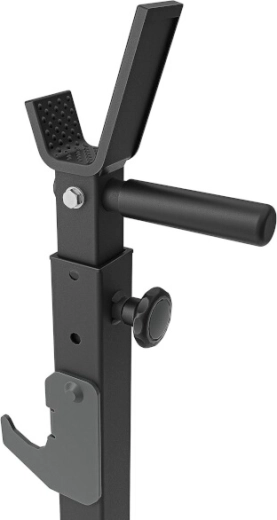 Pro maximální bezpečnost slouží rozměrné háky s možností umístění do 3 úrovní – bezpečně zachytí činku při neúspěšném opakování. Praktická madla s gumovými gripy umožňují provádět dipy, takže získáte multifunkční řešení pro silový trénink. Gumové koncovky podstav zabraňují klouzání a chrání podlahu.