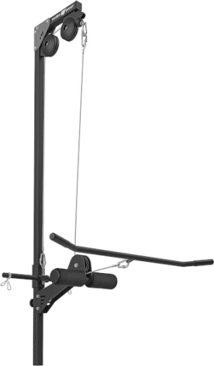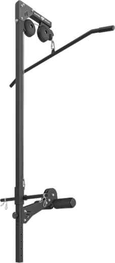 Systém využívá kotouče s průměrem otvoru 25 mm (nejsou součástí), které se nasazují na dva 20cm trny a jistí pružinovými uzávěry. Ocelové lanko s lisovanými oky a karabinami umožňuje bleskovou výměnu adaptérů, gumový doraz chrání rám a ložiskové kladky s hlubokou drážkou vedou lanko plynule a tiše. Pro spodní kladku stačí připojit prodlužovací lanko, zatímco výškově nastavitelné zarážky (4 polohy) a pohodlné pěnové válce z EVA pěny zajistí jistý posed i při těžších sériích.