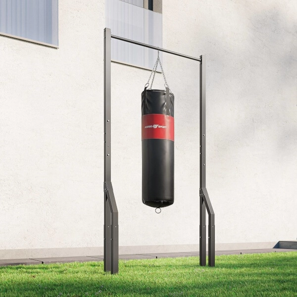 Univerzální hák uprostřed hrazdy umožňuje snadné zavěšení boxovacího pytle, lana či jiného příslušenství. Rychlá montáž i demontáž pro flexibilní trénink.