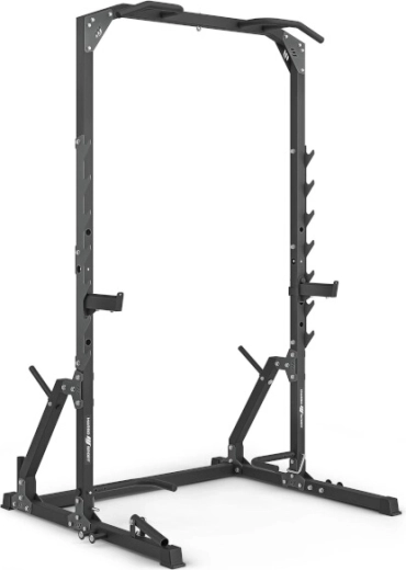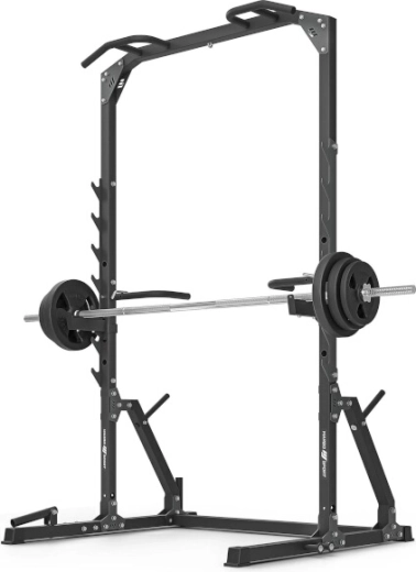 Robustní posilovací klec pro domácí trénink s činkou i vlastní vahou. Nabízí nosnost 250 kg, integrovanou hrazdu s více úchopy, 7 párů háků na osu, bezpečnostní vzpěry, podpěry na DIPy a kliky a trny na závaží pro vyšší stabilitu.