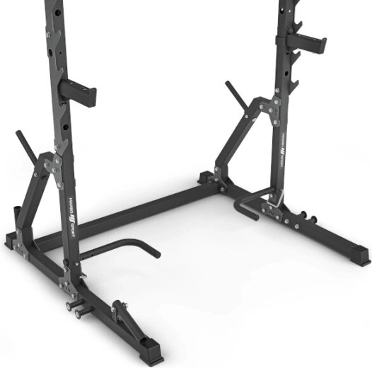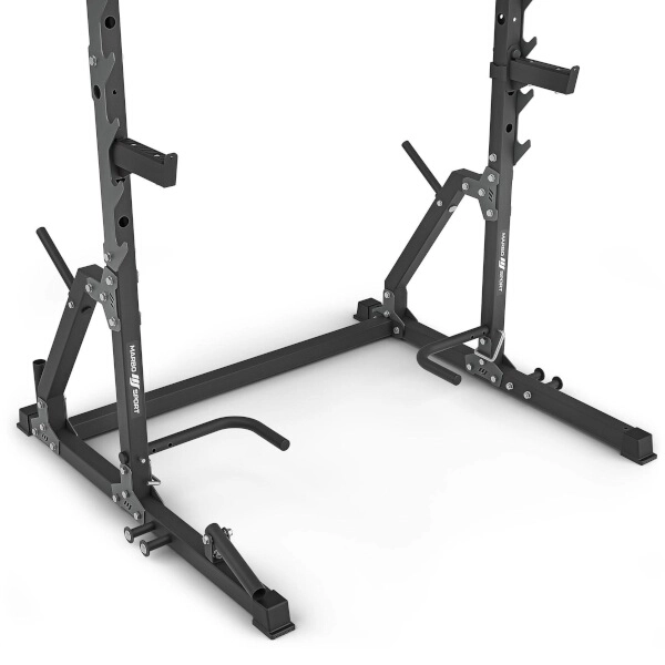Po stranách rámu najdete 7 párů háků pro komfortní odkládání osy (73–155 cm) a bezpečnostní vzpěry s rychlým zajištěním ve 4 polohách (75–118 cm). Z vnitřní strany jsou podpěry na DIPy a kliky s průměrem 3 cm, dvěma výškovými úrovněmi (17 a 105 cm) a 5 šířkovými nastaveními (56–74 cm). Zadní trny slouží jako stojan na kotouče a zároveň zvyšují stabilitu; nechybí držák na osu (Ø 30 mm) a přední multiosý kloub pro trénink s osou.