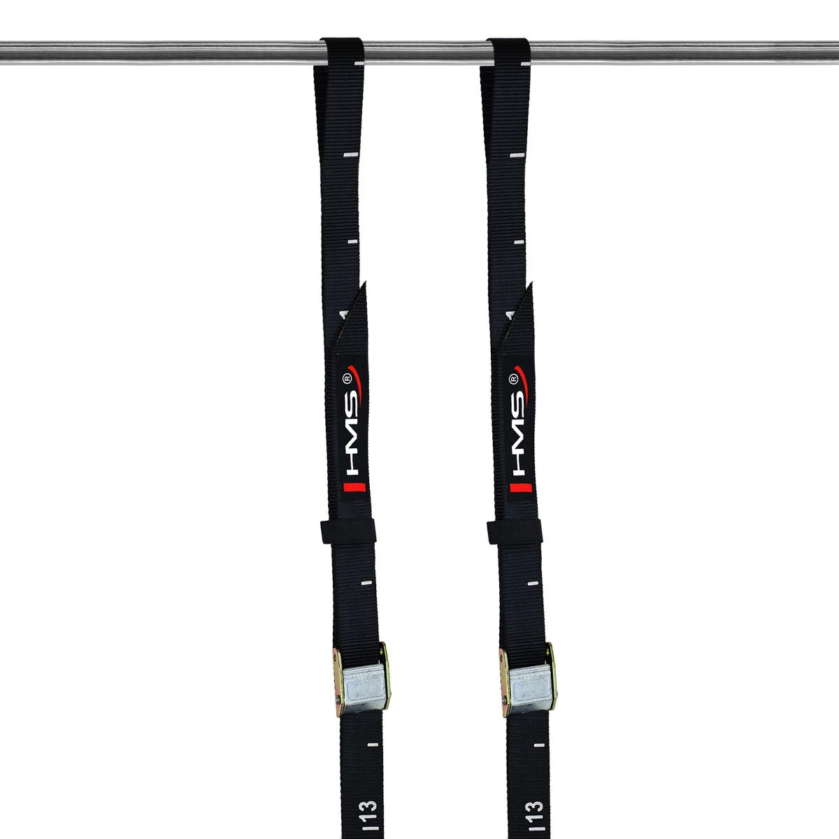 Nylonové popruhy o délce 440 cm se stupnicí po 7,5 cm a kovovými přezkami pro bezpečné a opakovatelné nastavení výšky kdekoliv.
