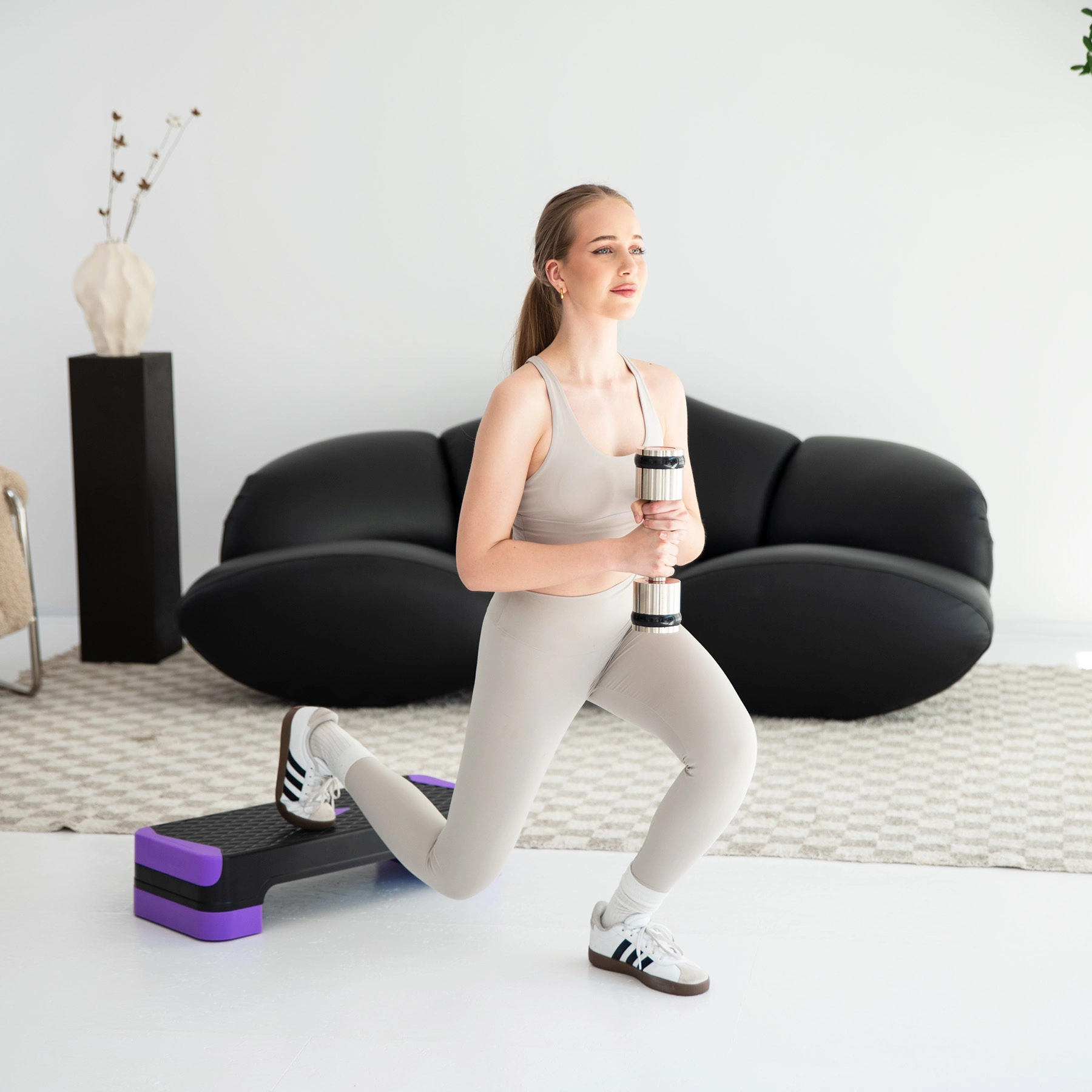 Připevněte balanční podložky a proměňte step v nestabilní platformu. Zapojíte hluboké svaly, zlepšíte koordinaci i rovnováhu.