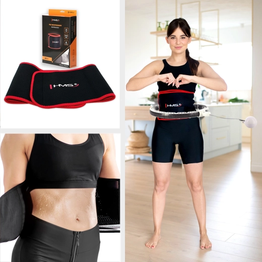 Kompletní fitness sada pro efektivní tvarování pasu a břicha: inteligentní masážní obruč HMS HHM16 s nastavitelným obvodem, rotujícím závažím, magnetickými masážními výstupky a přehledným počítadlem, doplněná o neoprenový zeštíhlující pás BR163 pro zvýšení pocení a podpory spalování kalorií.