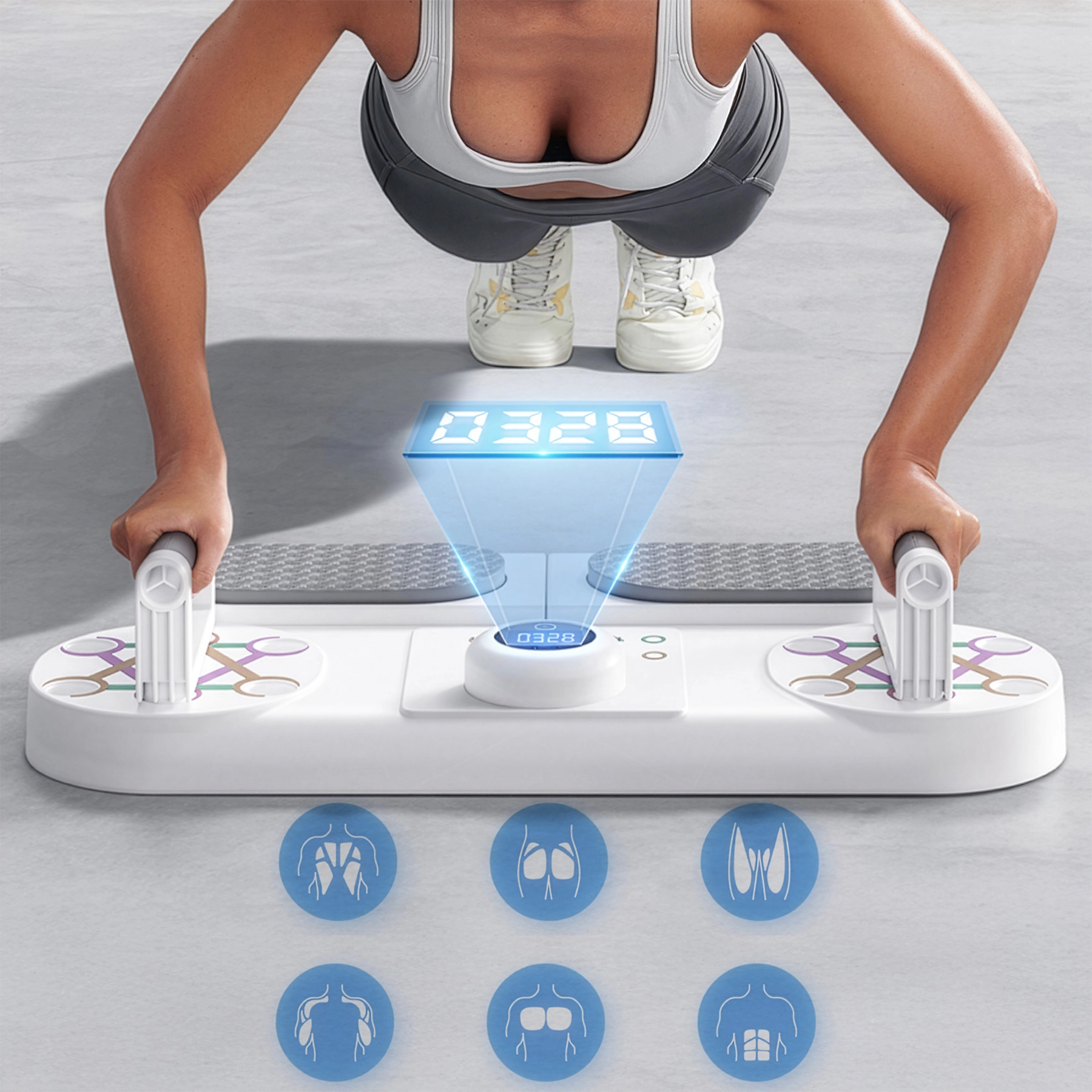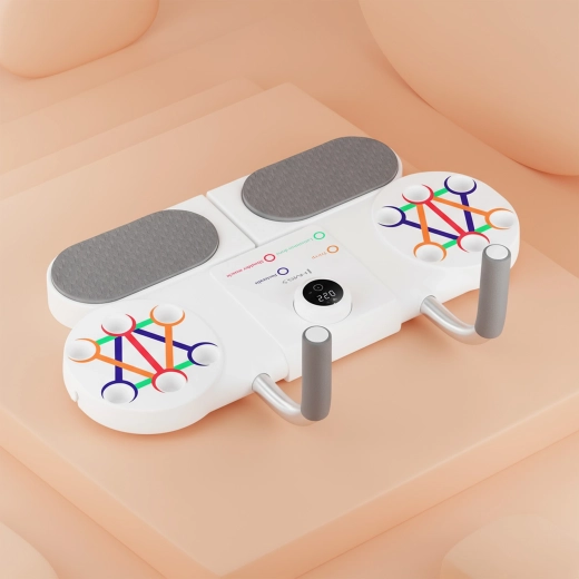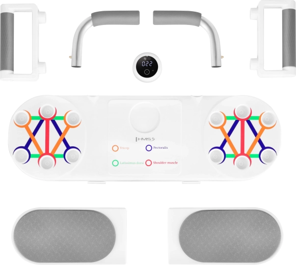 Kompaktní a univerzální pomůcka pro domácí trénink horní části těla a středu. Deska HMS DBP03 spojuje stabilní základnu pro plank, nastavitelné podpěry na kliky a chytrý počítač s optickým (IR) senzorem, který automaticky počítá opakování. Díky barevnému značení úchopů snadno zacílíte na hrudník, ramena, tricepsy i záda, zatímco protiskluzová textura a pěnové rukojeti a loketní podložky zajistí pohodlí a bezpečnost.