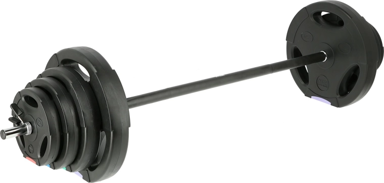 Osa o průměru 25,4 mm je kompatibilní s dodanými kotouči a poskytuje jistý úchop. Odolné materiály – ocel, PE plášť a cementová výplň – zajišťují dlouhou životnost a tichý dopad při tréninku doma.