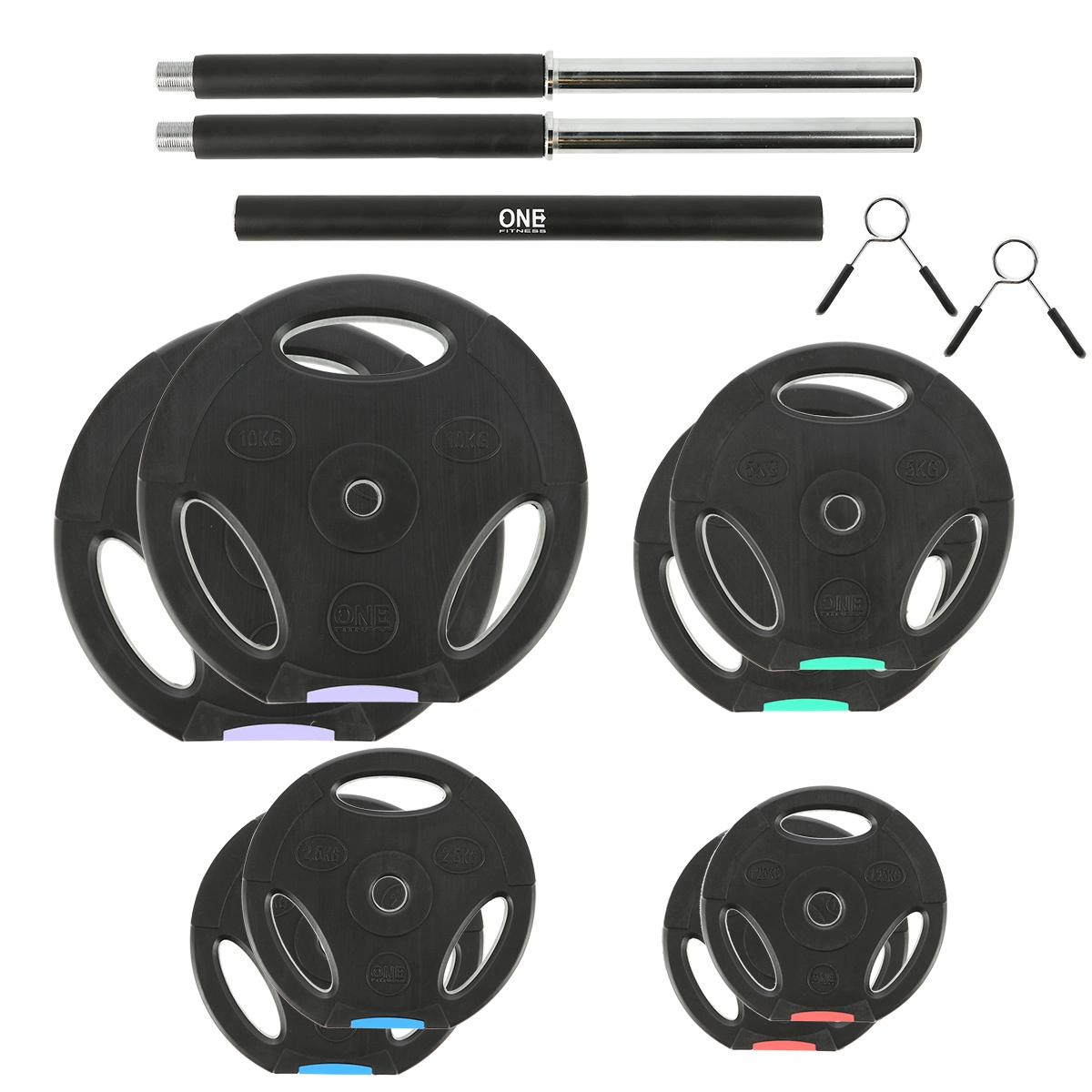 Sada obouruční činky ONE Fitness 42 kg nabízí univerzální řešení pro domácí posilování. Díky kombinaci více kotoučů si snadno nastavíte přesnou zátěž pro dřepy, bench press, mrtvé tahy i další cviky. Tri-grip design kotoučů usnadňuje manipulaci a pružinové uzávěry drží vše pevně na místě.