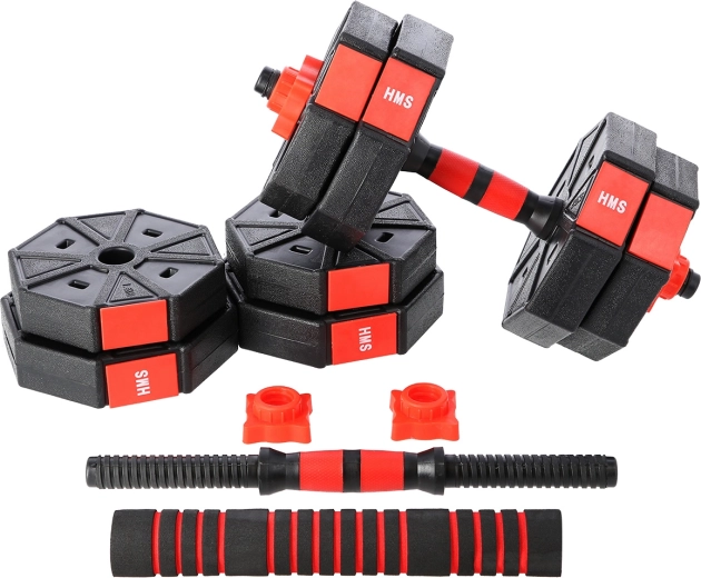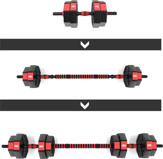 Sada HMS SGC15 je kompletní řešení pro domácí posilování: dvě jednoručky lze pomocí spojovacího dílu rychle proměnit v obouruční činku. Odolné kotouče z PVC plněné cementem a závitové hřídele s hvězdicovými uzávěry zajišťují stabilitu závaží během cviku. Šestihranný tvar navíc zabraňuje odvalování kotoučů.