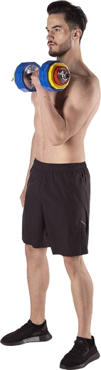 Tento kompaktní set nabízí vše, co potřebujete pro efektivní silový trénink doma: dvě nakládací jednoručky, spojovací díl pro rychlou přeměnu na obouruční činku, 12 barevných kotoučů a 4 šroubovací zámky s dodatečným jištěním. Chromovaná ocel zaručuje dlouhou životnost a PVC povrch kotoučů chrání podlahu před poškozením.