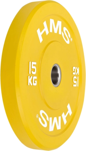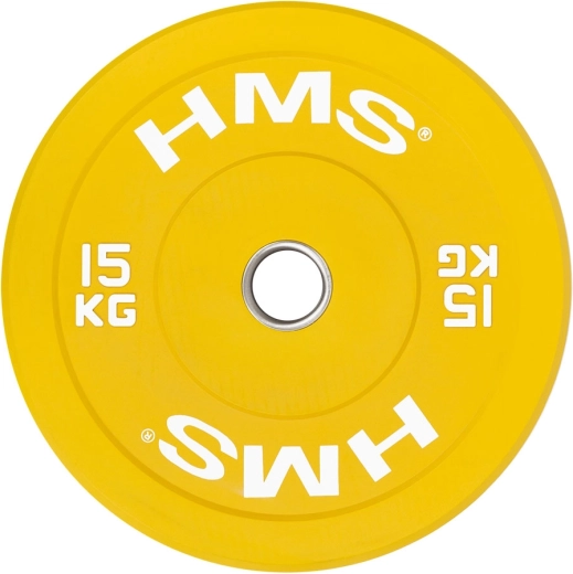 Profesionální barevný bumper kotouč HMS o hmotnosti 15 kg pro vzpěračský a funkční trénink. Díky odolné pryži a nerezové středové vložce chrání podlahu i osu, tlumí hluk při odhozu a je plně kompatibilní s olympijskými osami 50 mm. Žluté barevné provedení odpovídá závodnímu značení pro snadnou orientaci na tréninku.