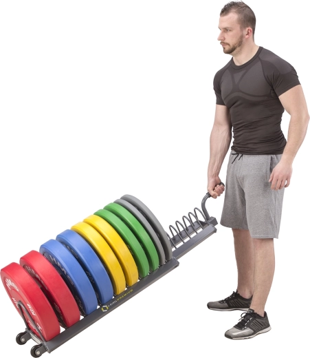 Integrovaná transportní kolečka a ergonomické madlo umožňují rychlý a bezpečný přesun celé sady kotoučů po posilovně bez zbytečné námahy.