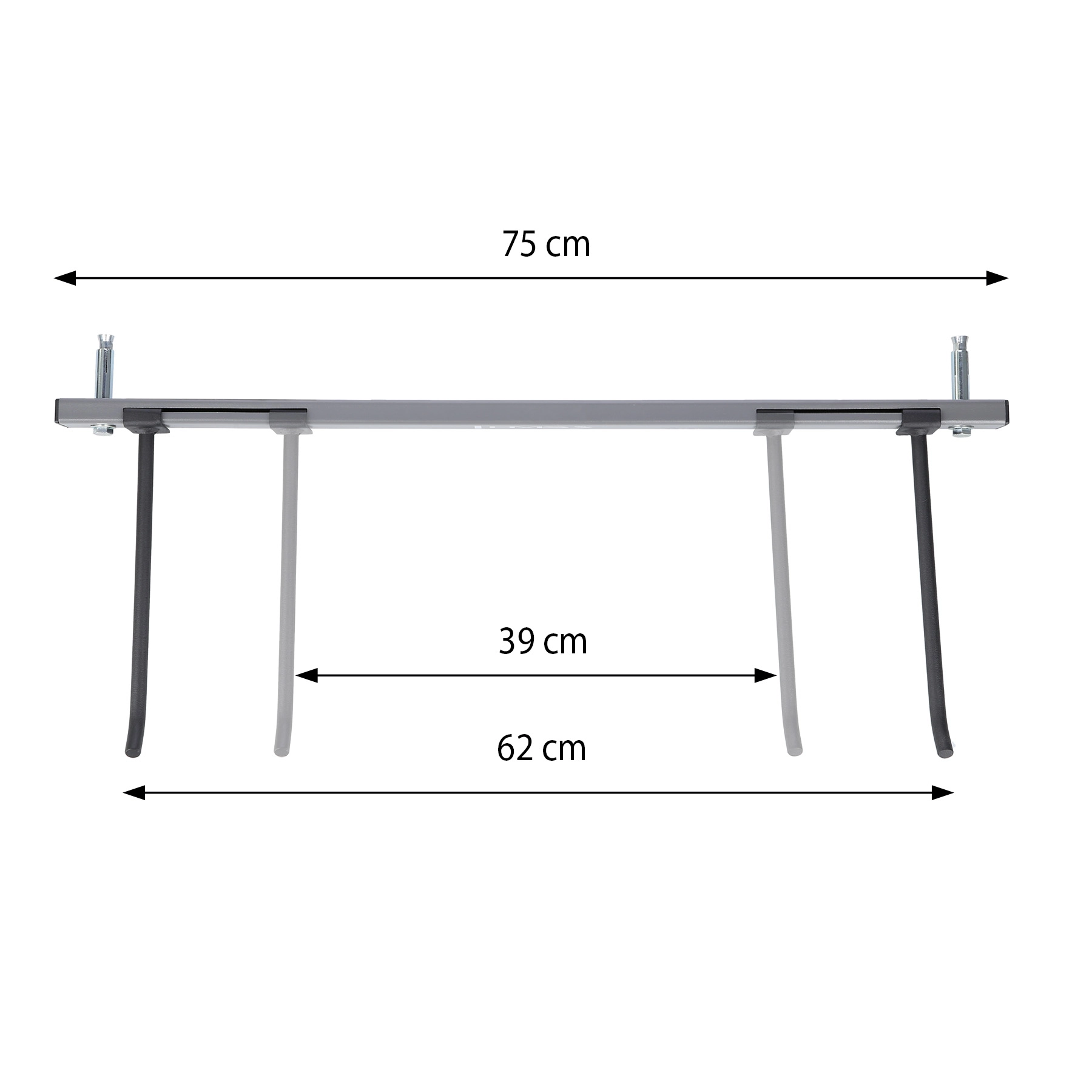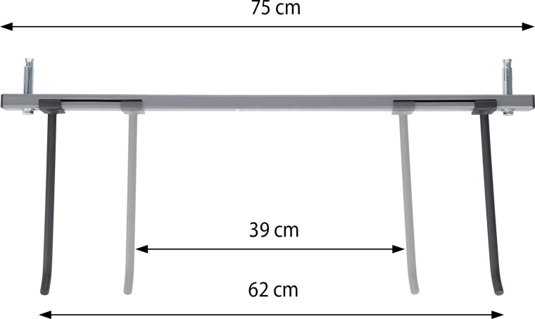 Háky o délce 25 cm a rozteč 39–62 cm umožňují zavěsit až 16 podložek (dle tloušťky) a přizpůsobit držák různým typům podložek s oky.