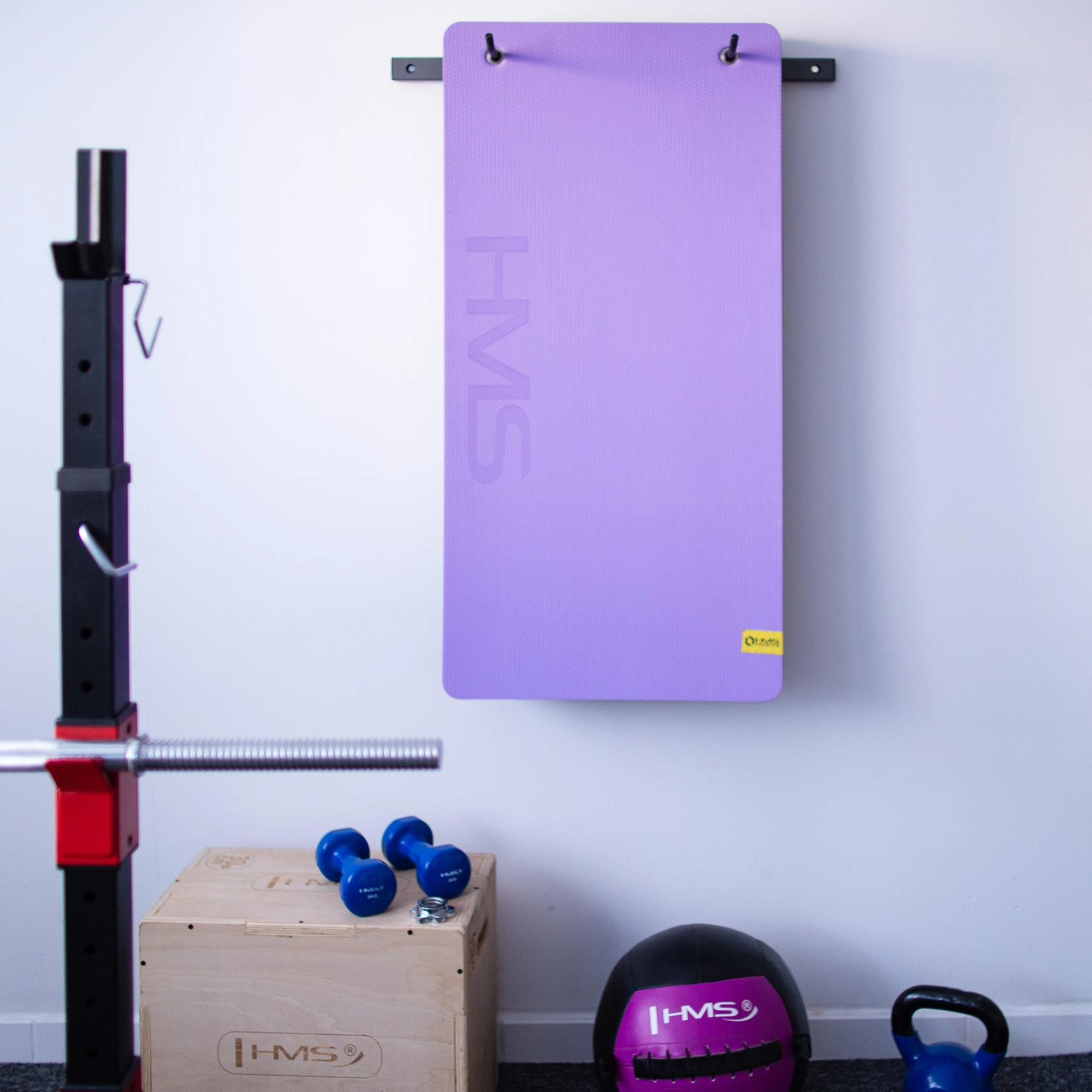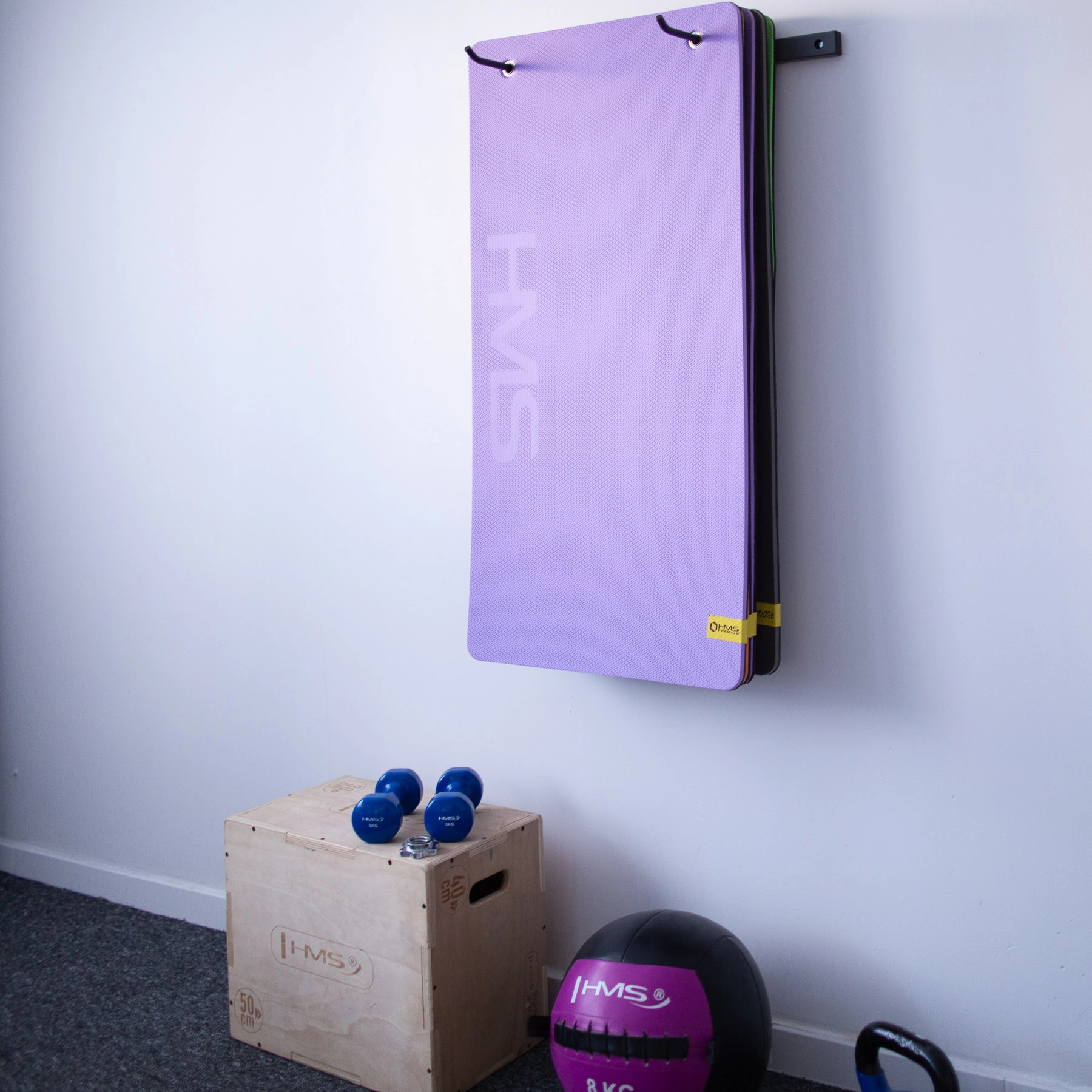 Nástěnný držák na podložky HMS STR30 udržuje podložky mimo podlahu, šetří prostor a zajišťuje pořádek v tělocvičně, studiu či kanceláři. Odolná ocelová konstrukce a promyšlené rozteče háků (39–62 cm) podporují pohodlné zavěšení různých typů podložek s oky.