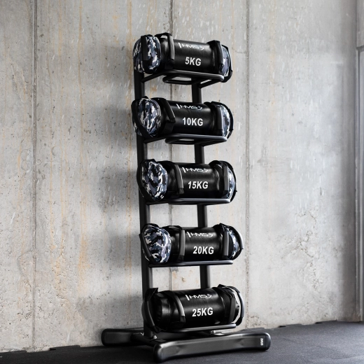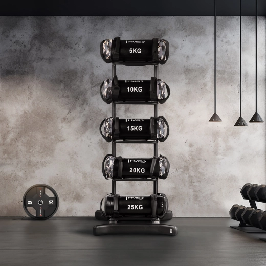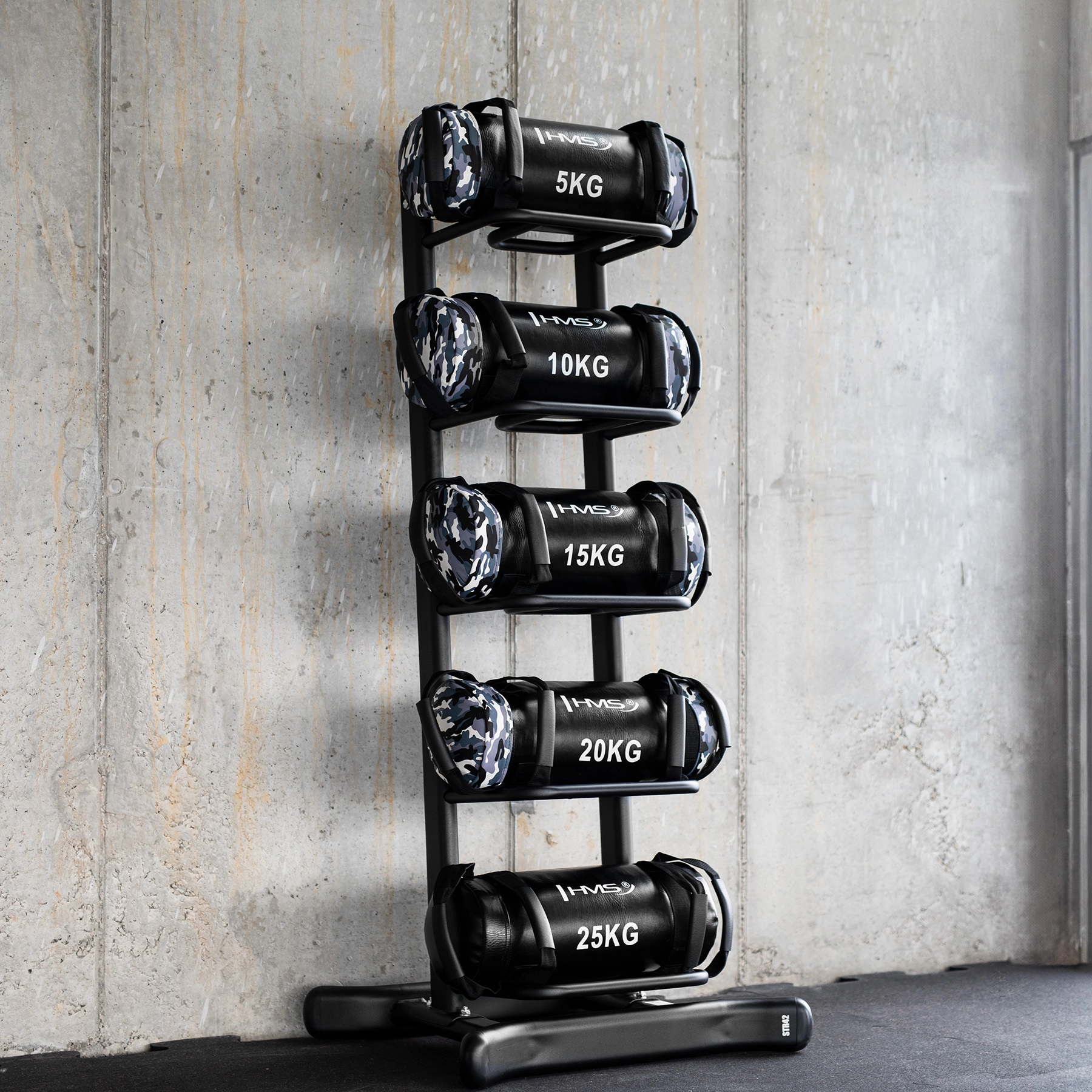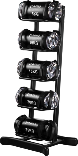 HMS STR42 je robustní a vysoký stojan navržený pro bezpečné a přehledné uložení až pěti power bagů. Díky vertikálnímu uspořádání šetří místo, zlepšuje organizaci tréninkové zóny a umožňuje rychlý výběr správné hmotnosti. Pevná ocelová konstrukce s protiskluzovými prvky zaručuje maximální stabilitu i při plném zatížení.