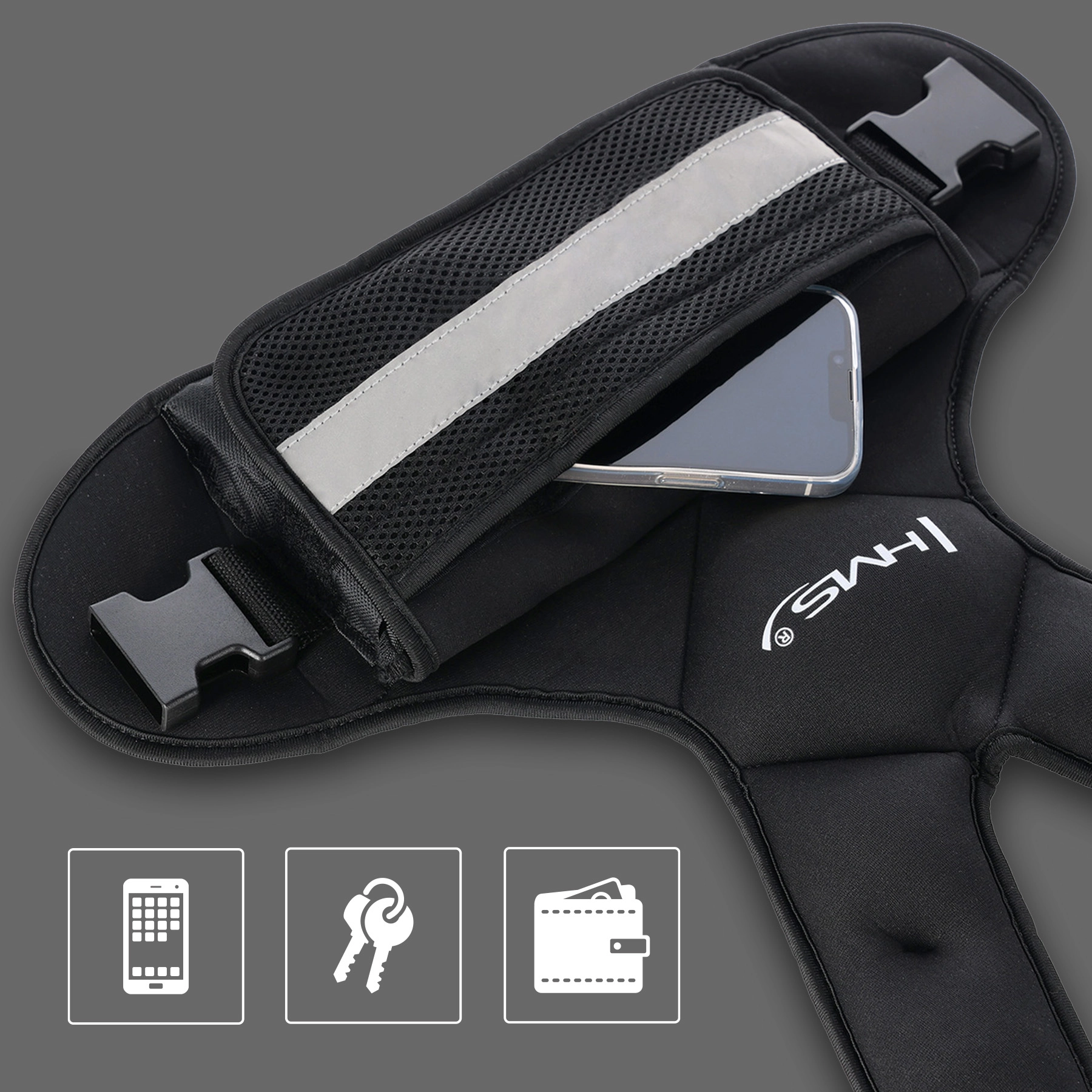 Praktická elastická síťovaná kapsa na přední straně pojme telefon, klíče či drobnosti, zatímco neoprenový, potuodolný materiál a nastavitelné popruhy zajišťují jisté a pohodlné usazení na těle. Reflexní prvky zvyšují bezpečnost při tréninku venku za zhoršené viditelnosti.