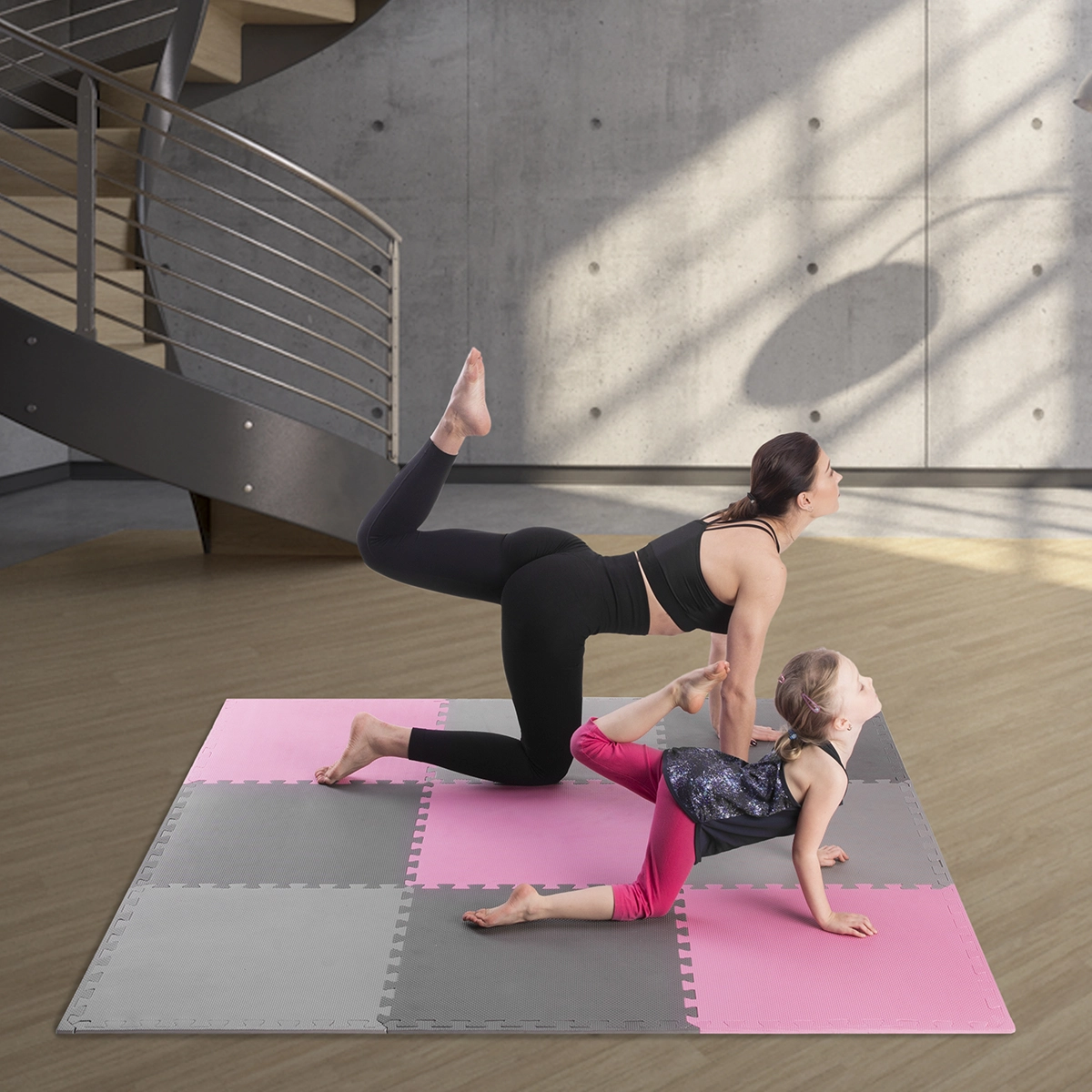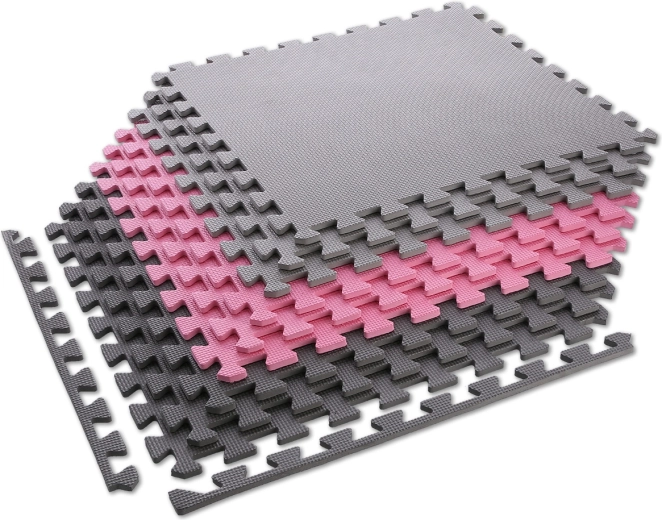 Každý díl má zámky po obvodu, takže můžete skládat malé zóny i pokrytí celé místnosti. Balení obsahuje 9 čtvercových dílů v růžové, světle a tmavě šedé barvě a 12 zakončovacích lišt pro čisté, rovné okraje bez zoubků.